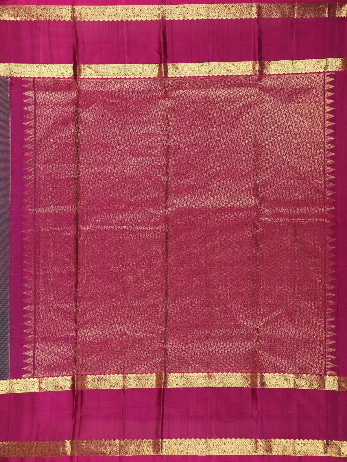 The saree is complemented by a striking contrast magenta pink zari border, intricately woven with antique gold zari that adds a luxurious festive touch. The bold border perfectly frames the saree, creating a harmonious balance between tradition and vibrance.