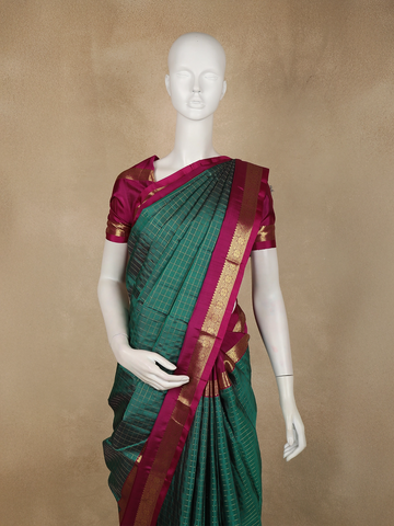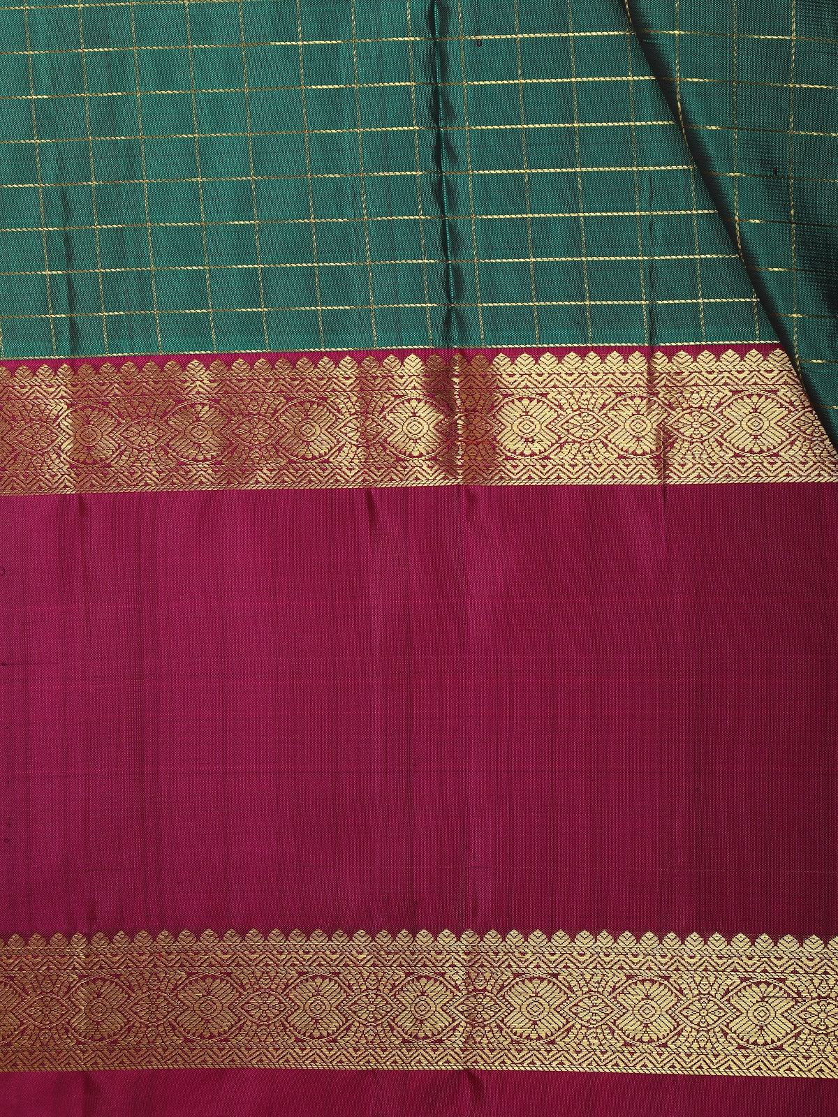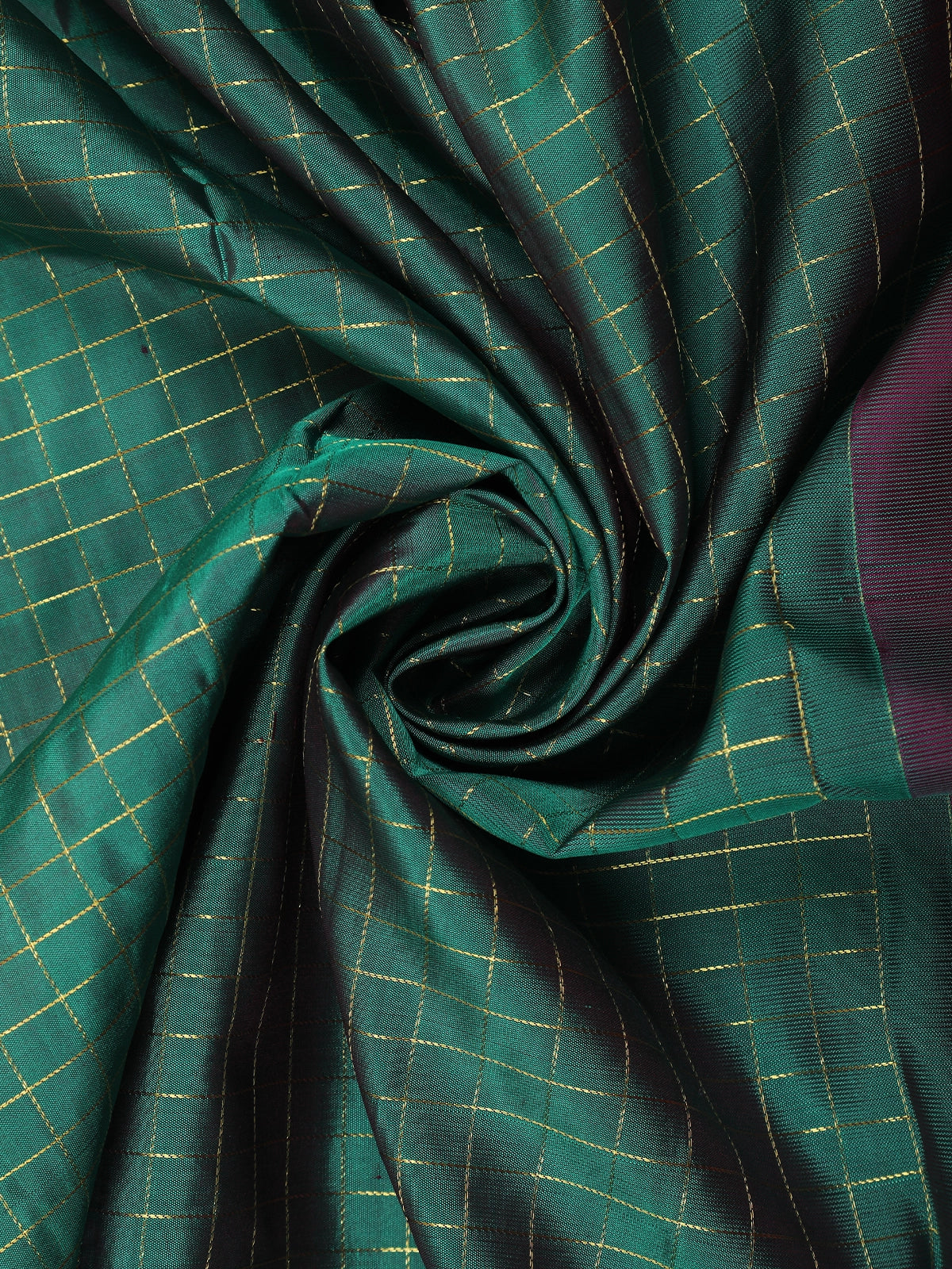 This Teal Green Checks Zari Woven Pure Kanchipuram Silk Saree showcases timeless elegance with a classic South Indian appeal. The rich teal green base is beautifully enhanced with fine zari-woven check patterns, lending a structured yet graceful look to the drape. Crafted in lustrous pure Kanchipuram silk, the saree offers a smooth texture and a regal fall.