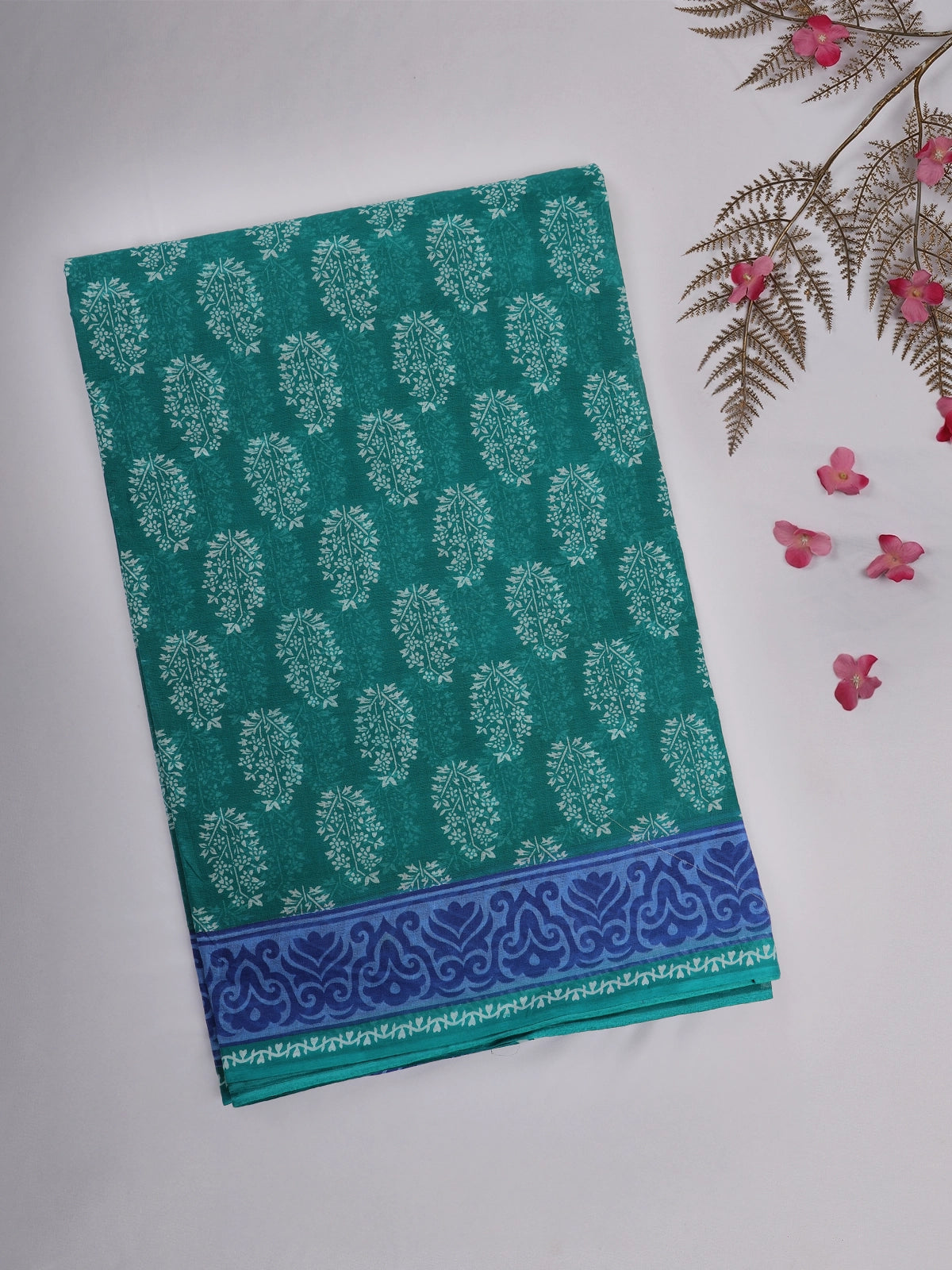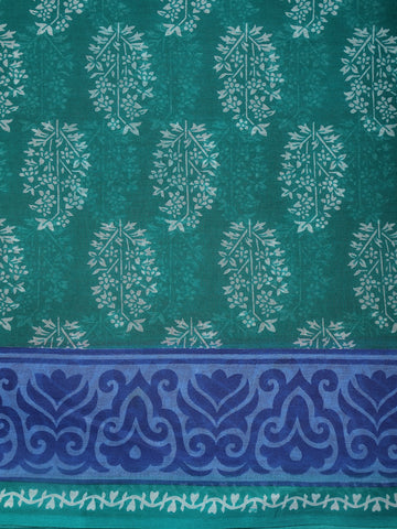 Teal Green Floral and Leaf Printed karishma Cotton Saree with Blue Ornamental Border