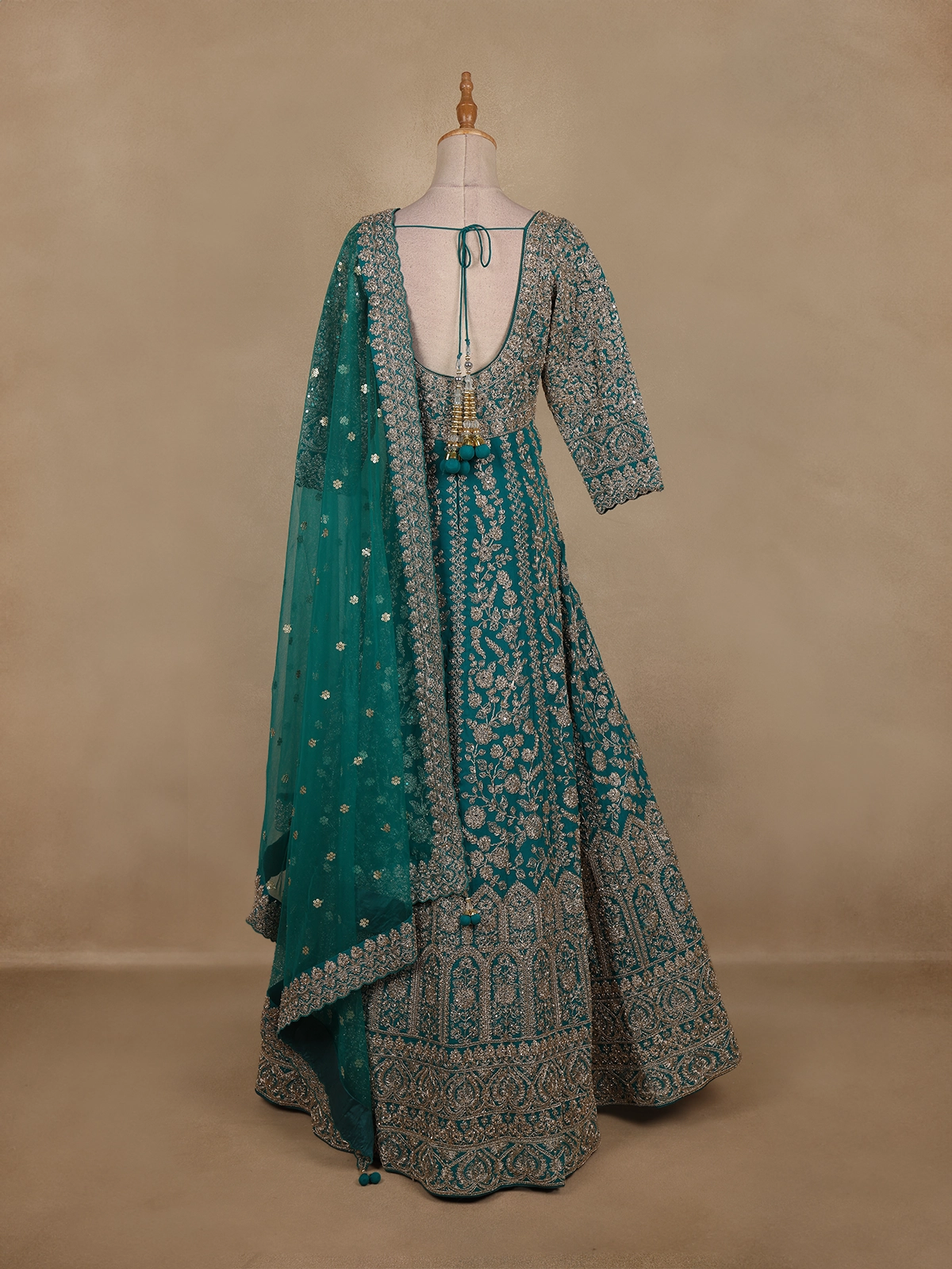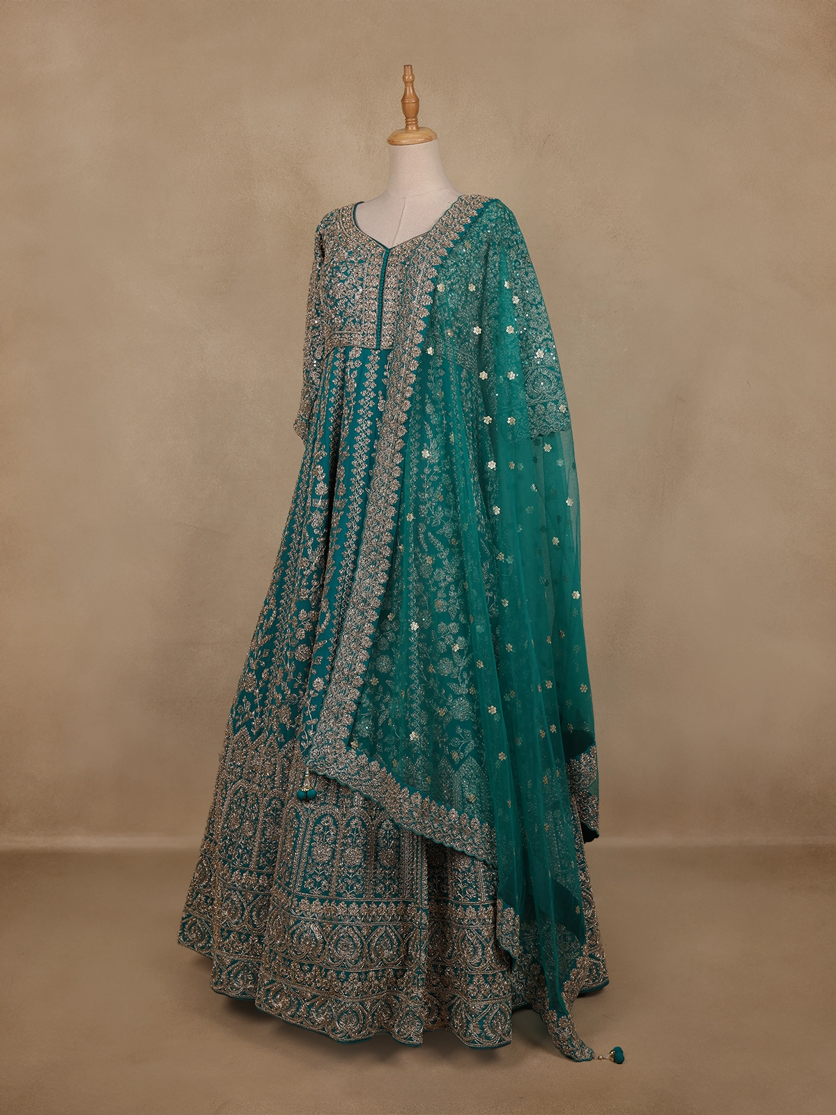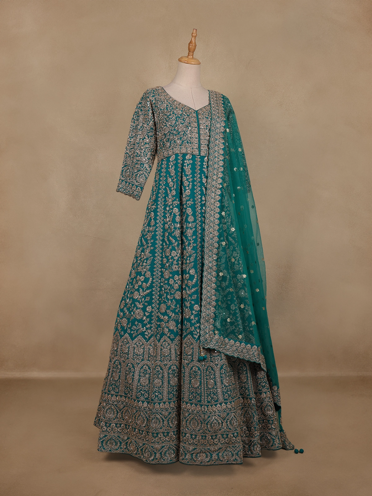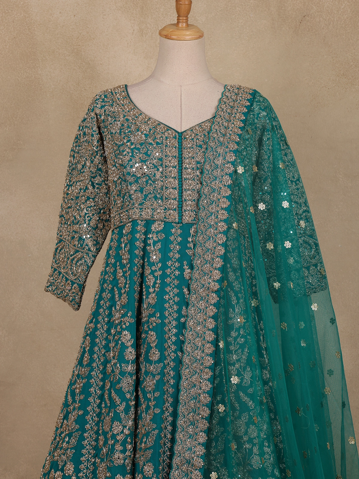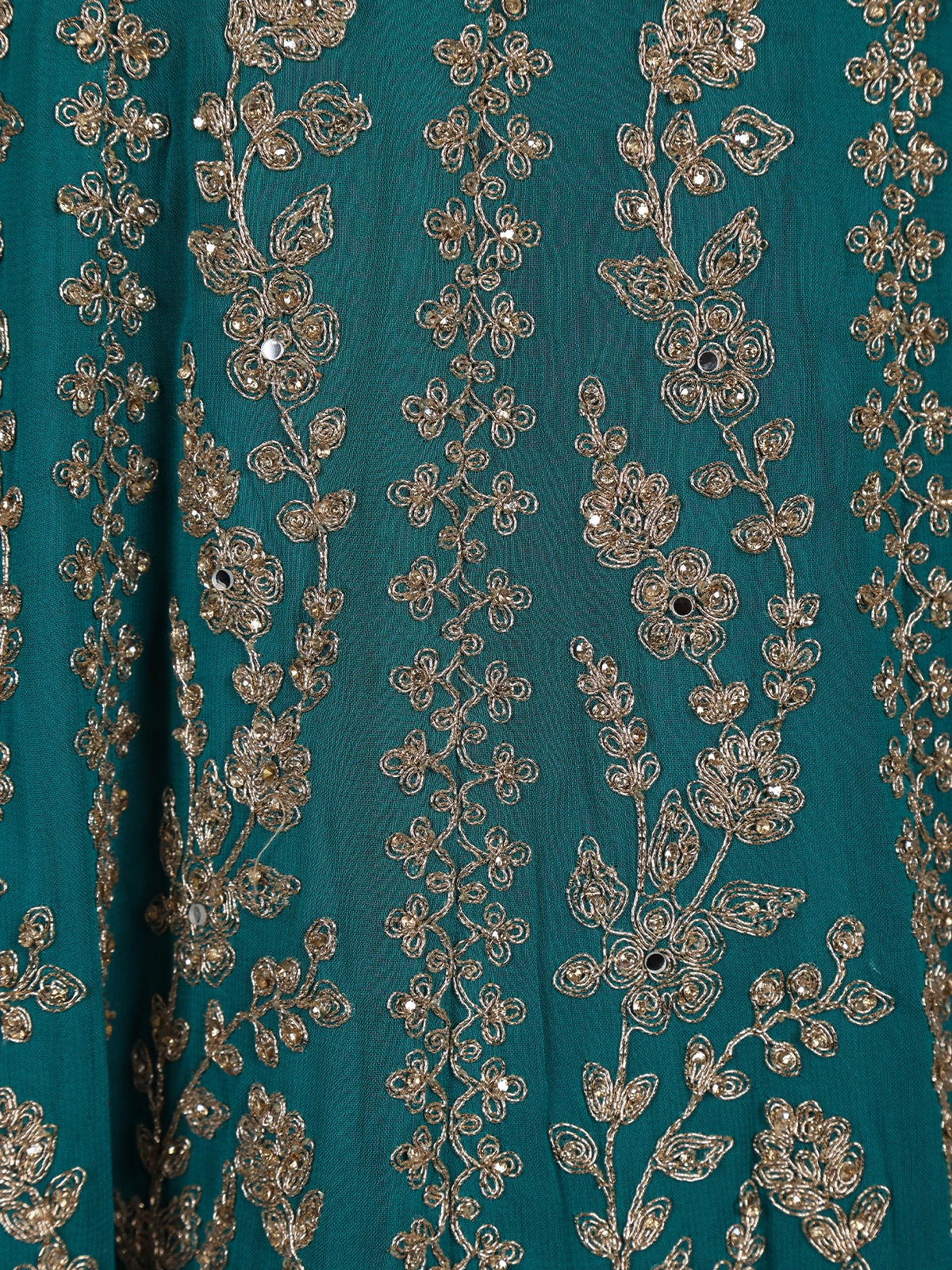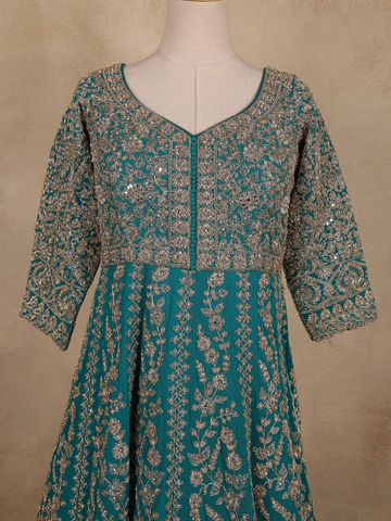 Intricately adorned with floral embroidery in metallic threads and sequins, the design weaves a symphony of shimmer and grace across the rich teal green base. The flattering silhouette, enhanced by a soft inner lining, offers both comfort and poise, while the sheer embroidered sleeves and neckline add a touch of ethereal beauty.