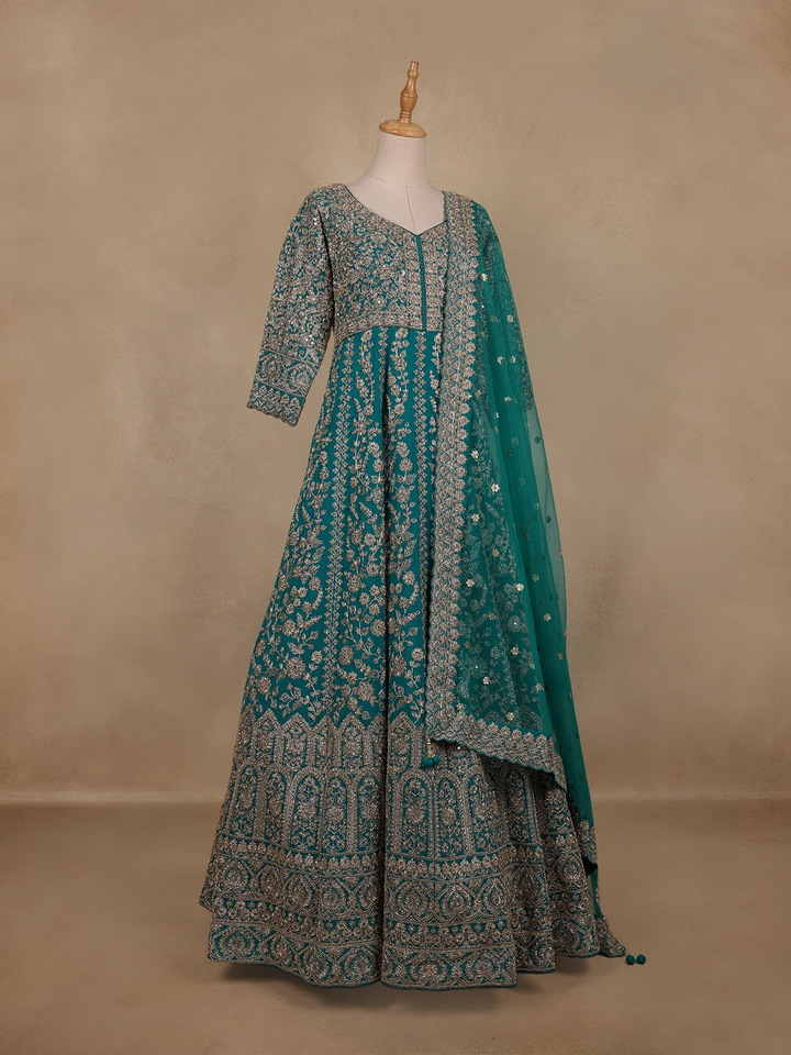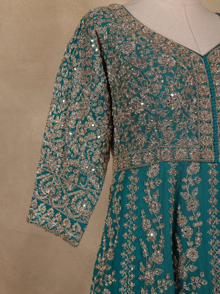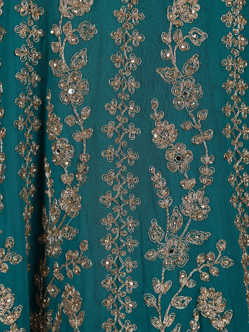 Teal Green Floral Embroidered Design Net Gown