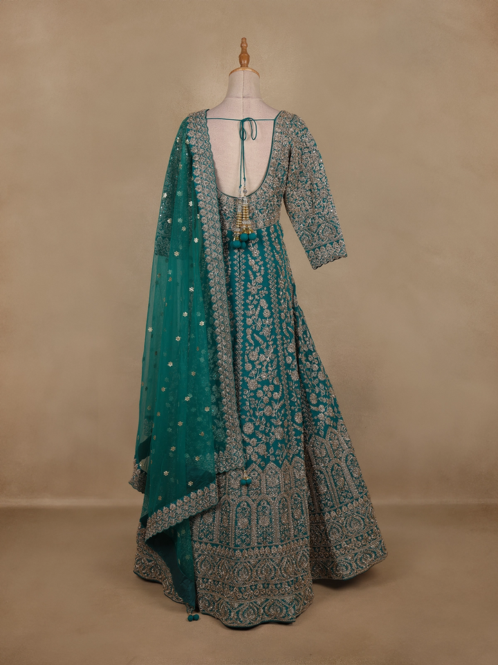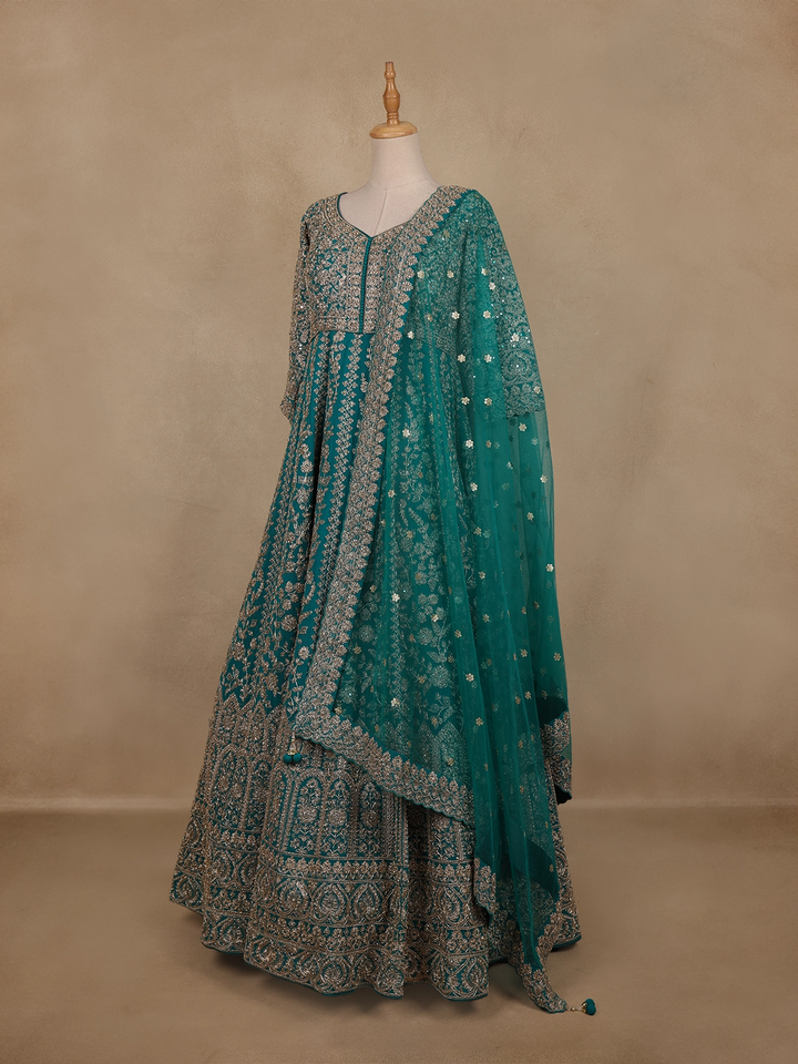 Drape yourself in elegance with this Teal Green Floral Embroidered Net Gown, a masterpiece of sophistication and sparkle. Crafted from delicate net fabric, the gown flows gracefully with every movement, exuding a fairy-tale allure perfect for grand celebrations.