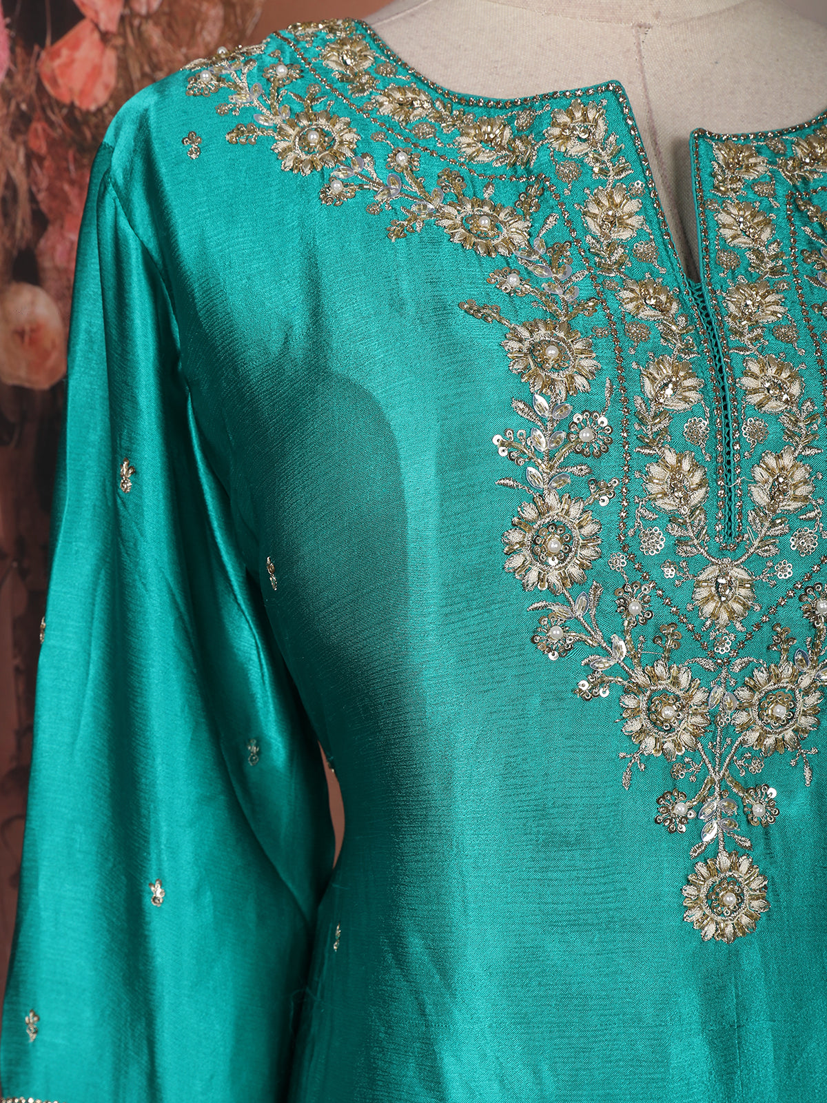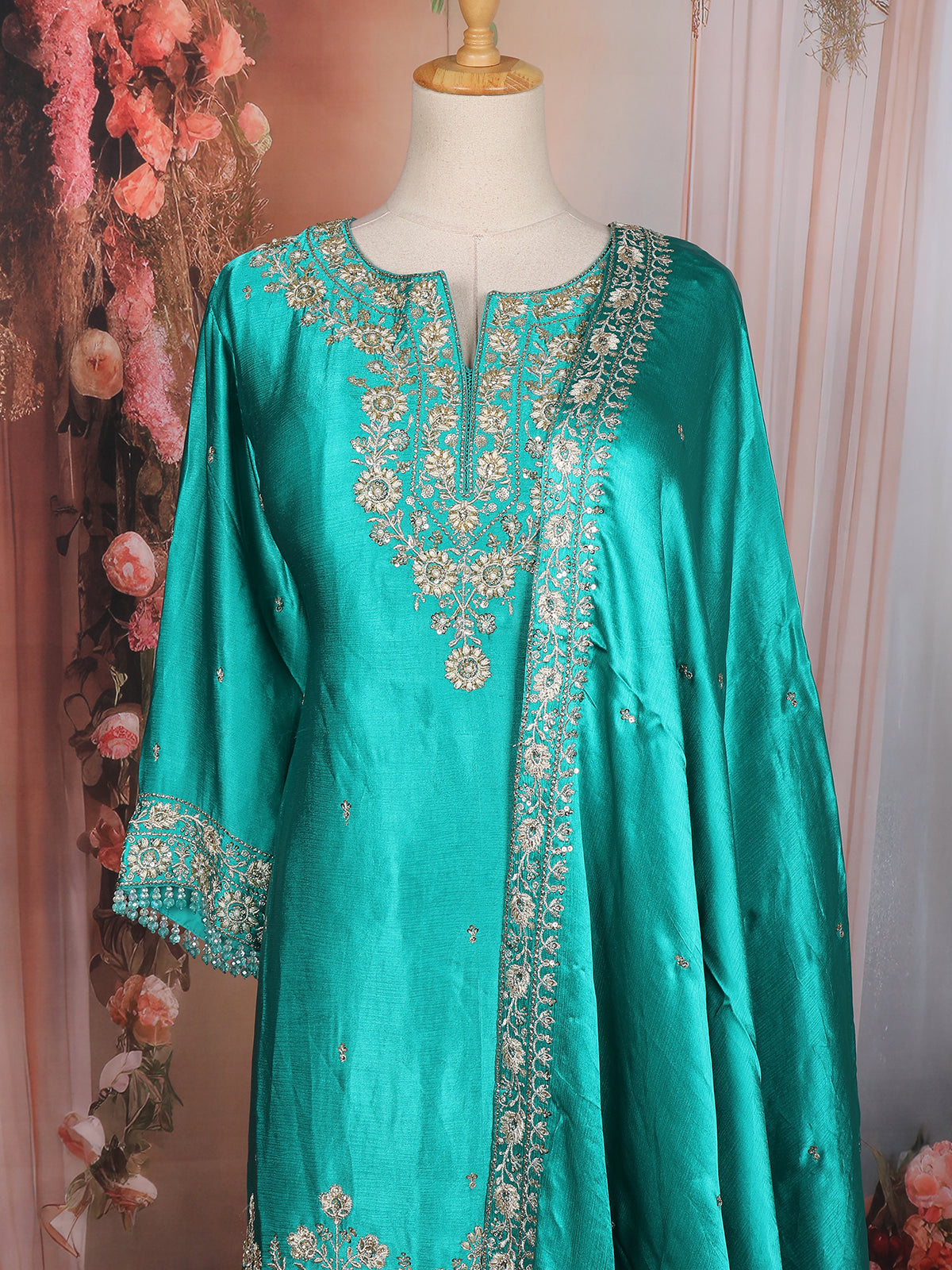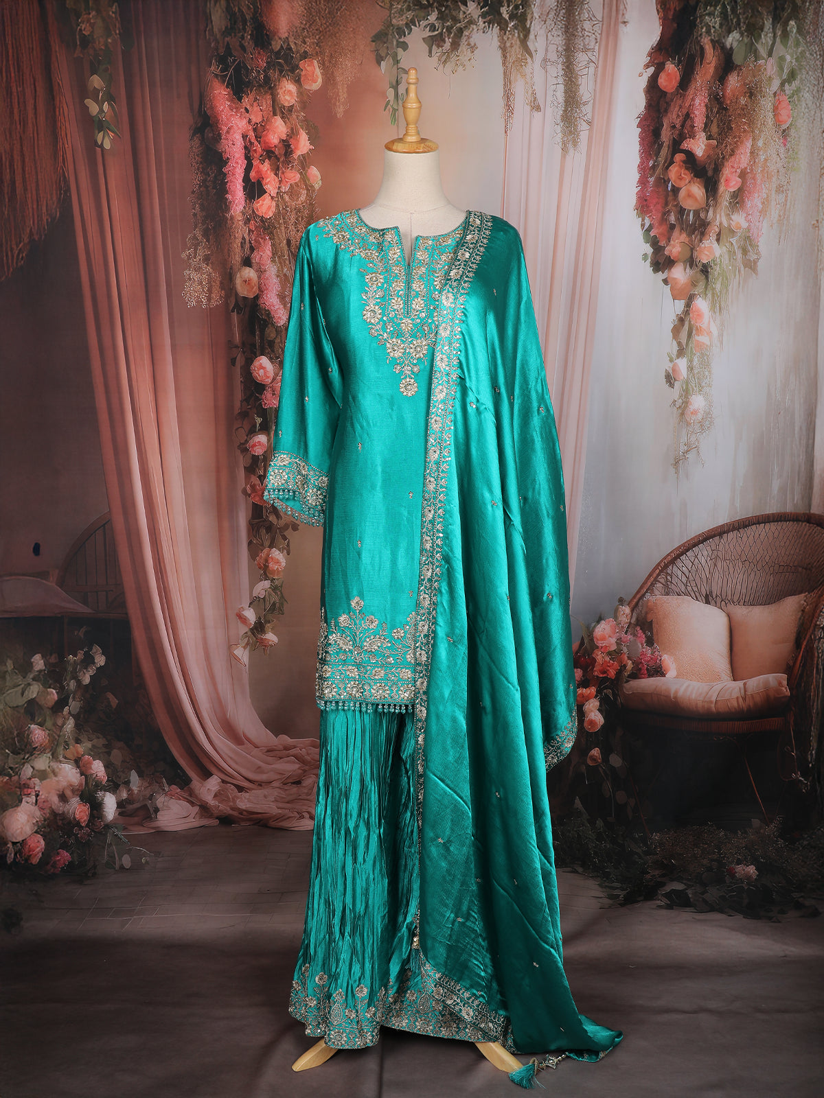 Teal Green Floral Embroidered Design Satin Palazzo Suit with Dupatta