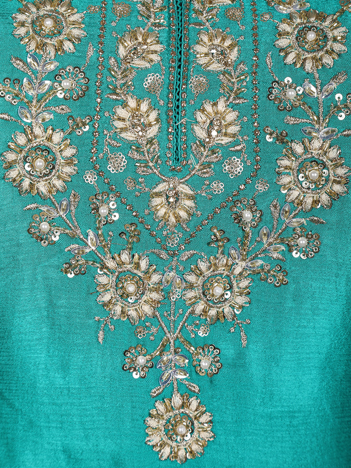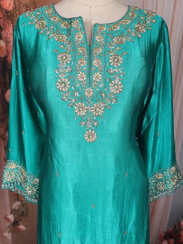 Drape yourself in luxurious elegance with this stunning teal green satin palazzo suit. The kurta features a gorgeously detailed floral embroidery along the neckline, cuffs, and hem — highlighted with shimmering zari and sequins that deliver a regal festive glow. The smooth sheen of satin fabric enhances the graceful charm, while the relaxed straight silhouette ensures all-day comfort.