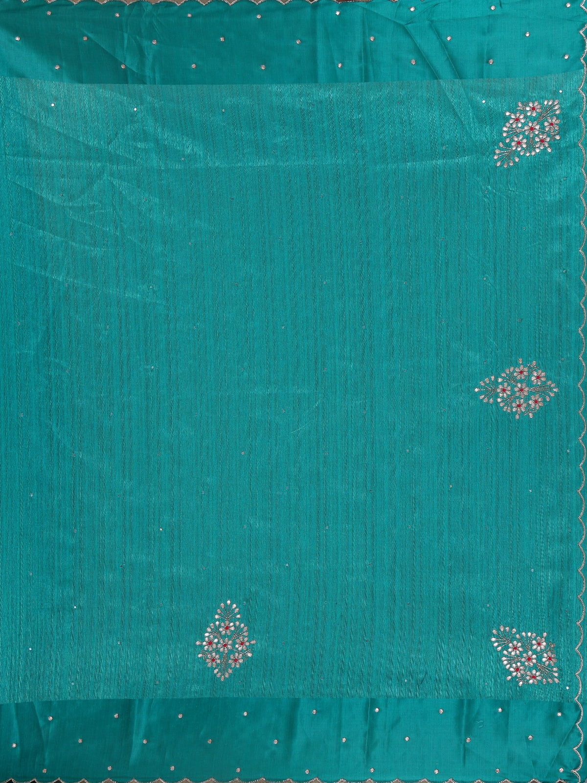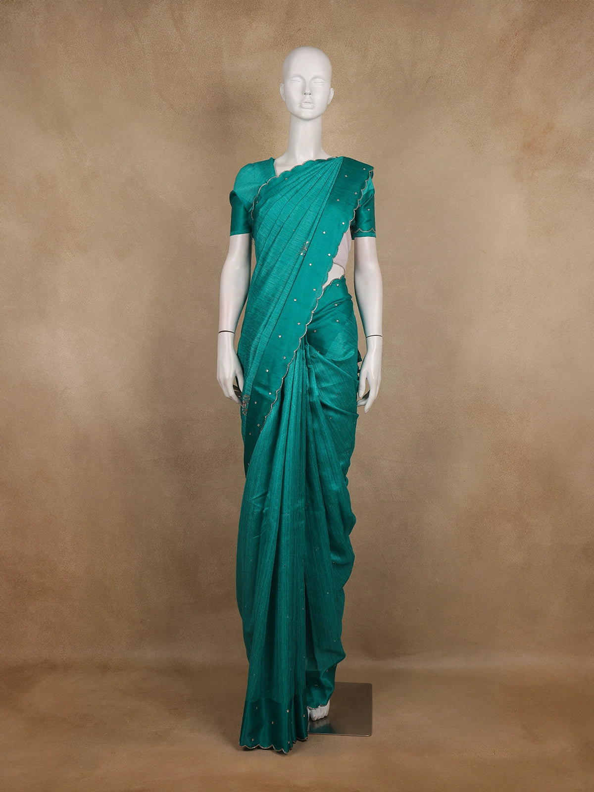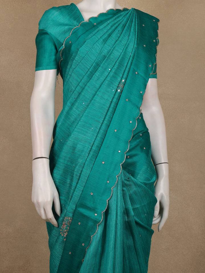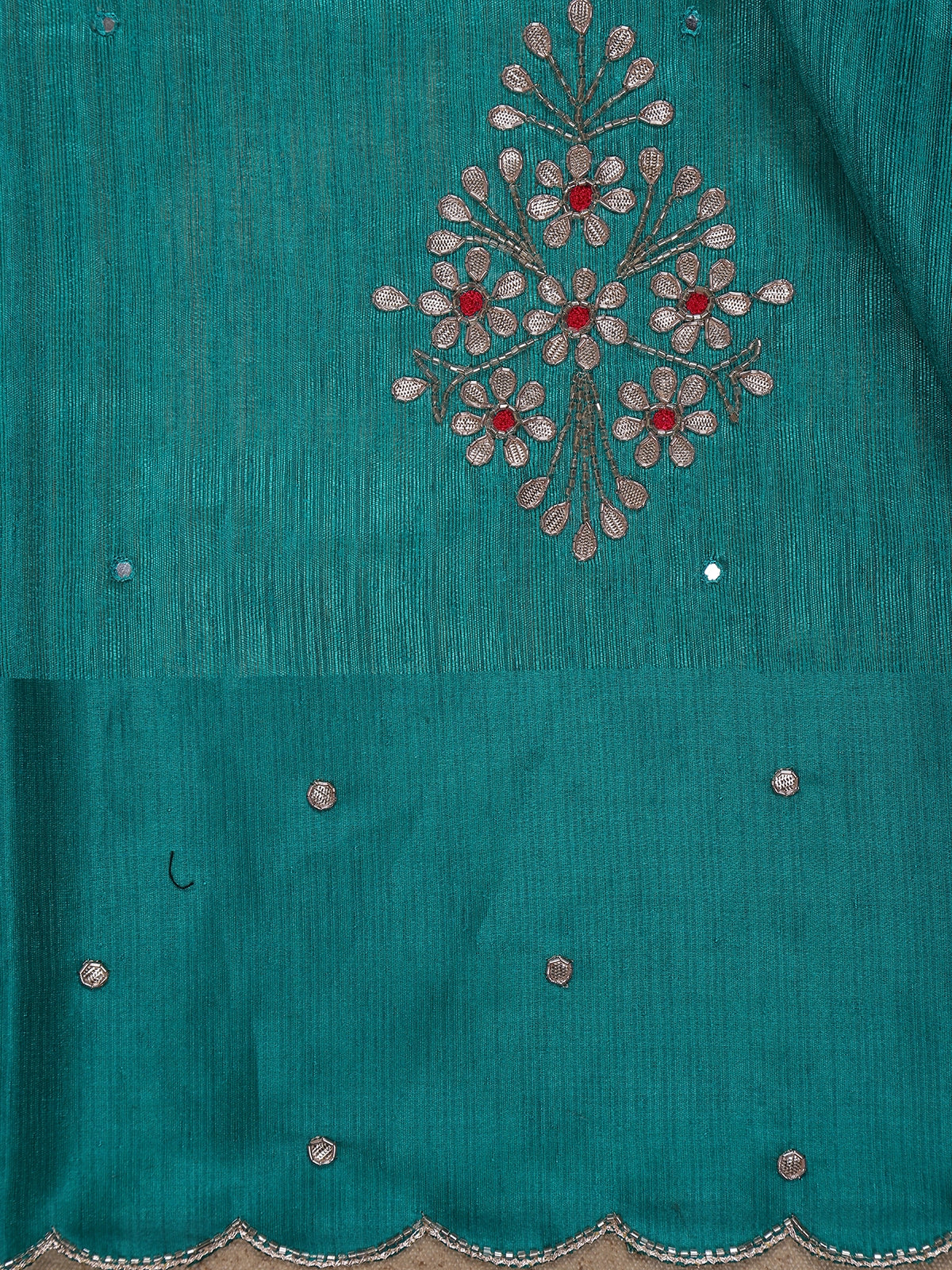 Grace your special occasions in the timeless elegance of this Teal Green Raw Silk Saree. The lustrous raw silk fabric lends a refined sheen and textured richness, while delicate floral embroidery with beads and sequins enhances its charm. The saree is beautifully framed with a scalloped border outlined in zari thread, adding a sophisticated shimmer that complements the subtle sparkle across the drape. Its lightweight texture and structured fall make it perfect for festive celebrations, receptions, or evening parties.