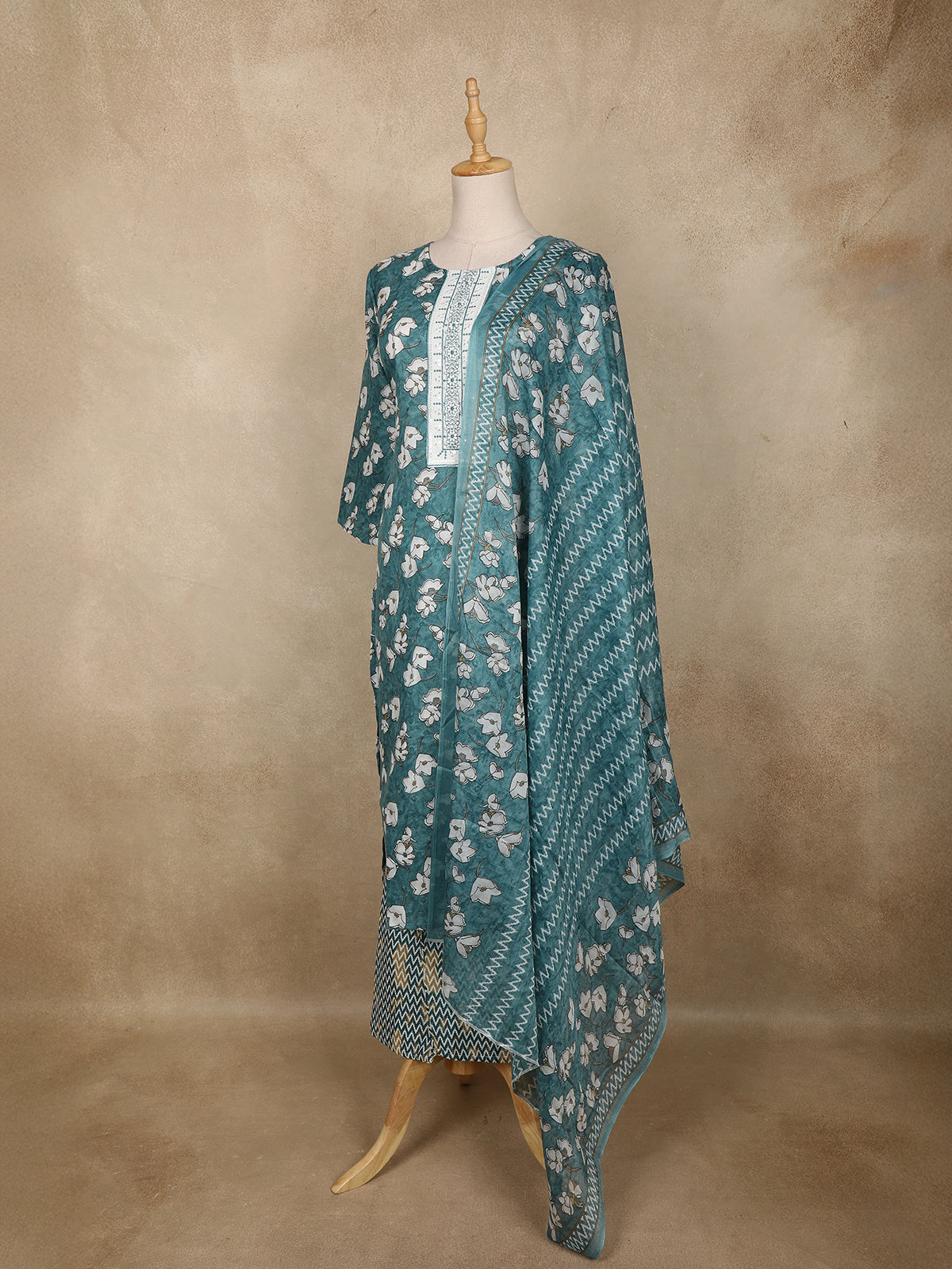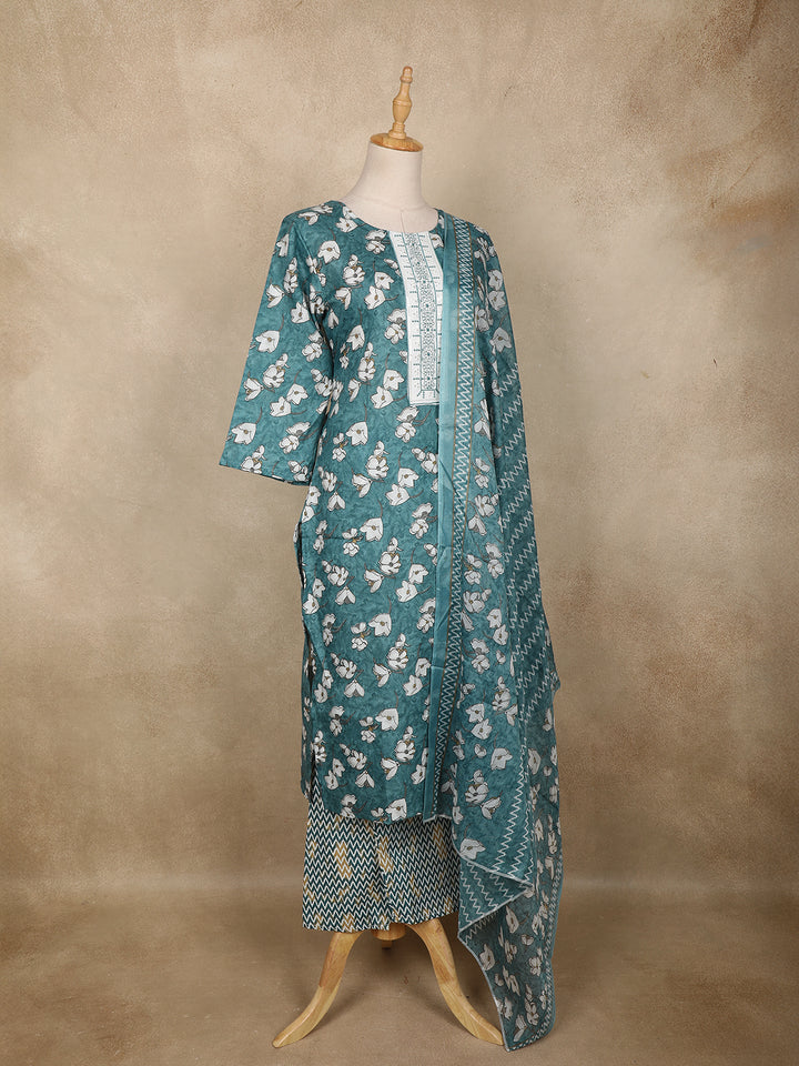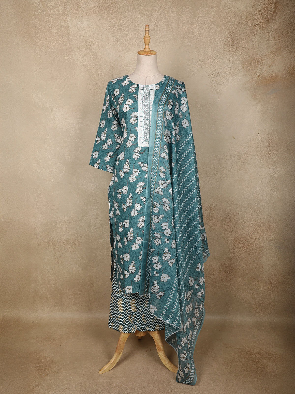 Add a refreshing splash of style to your ethnic wardrobe with this Teal Green Floral Printed Cotton Salwar Suit. Designed in a straight-cut silhouette, the kurta features beautiful floral prints that enhance its feminine charm. The embroidered neckline adds a refined traditional appeal, while the breathable cotton fabric ensures maximum comfort throughout the day. Paired with a coordinated printed bottom and a soft printed dupatta, this 3-piece set is the perfect pick for elegant everyday dressing.