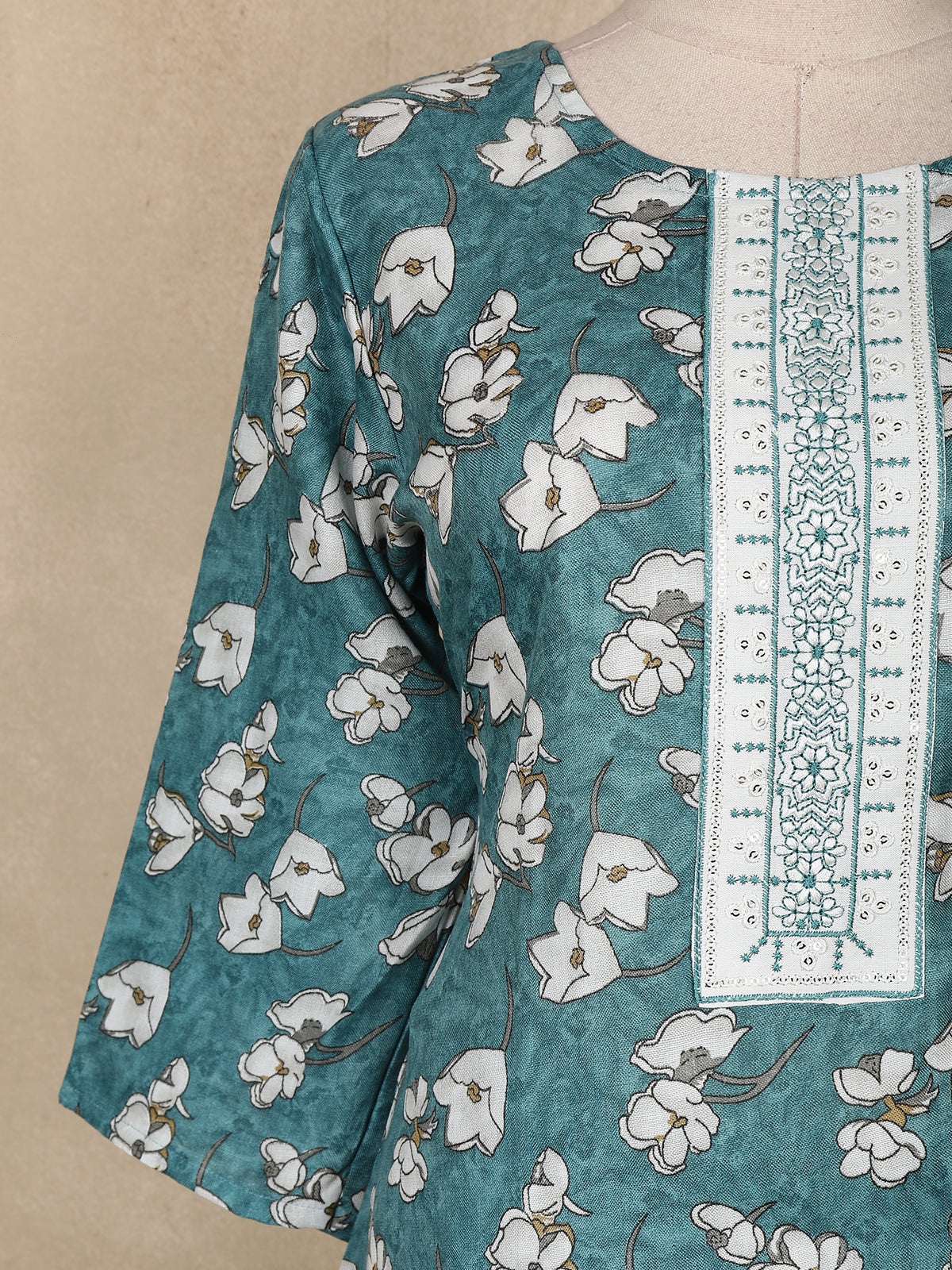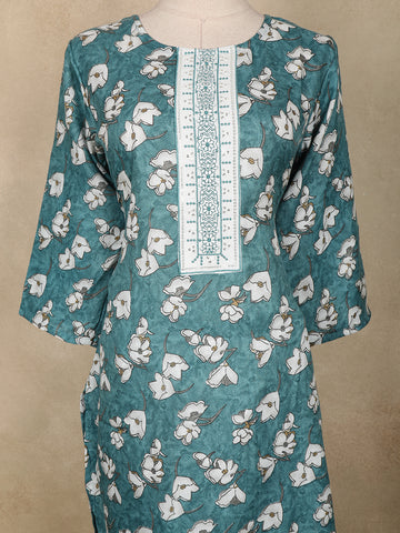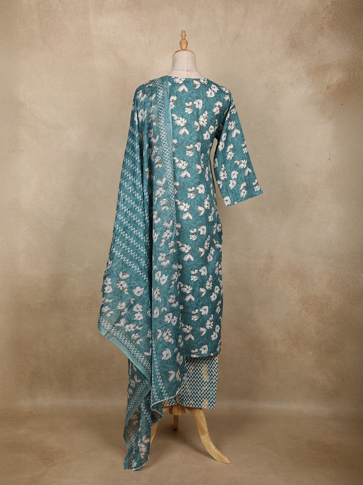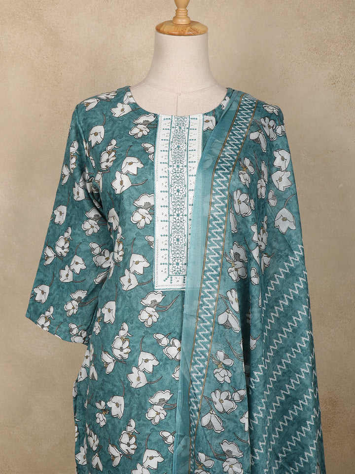 Add a refreshing splash of style to your ethnic wardrobe with this Teal Green Floral Printed Cotton Salwar Suit. Designed in a straight-cut silhouette, the kurta features beautiful floral prints that enhance its feminine charm. The embroidered neckline adds a refined traditional appeal, while the breathable cotton fabric ensures maximum comfort throughout the day. Paired with a coordinated printed bottom and a soft printed dupatta, this 3-piece set is the perfect pick for elegant everyday dressing.
