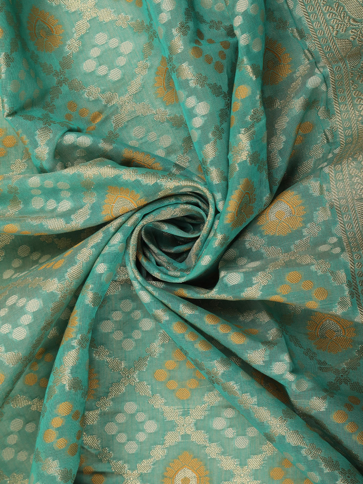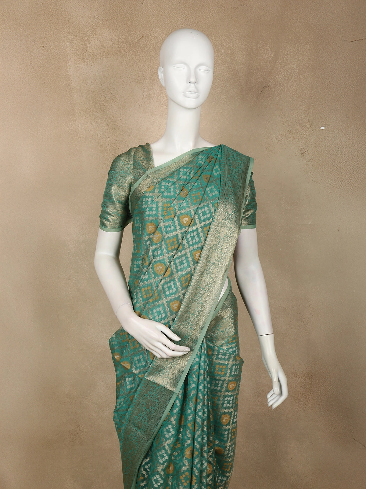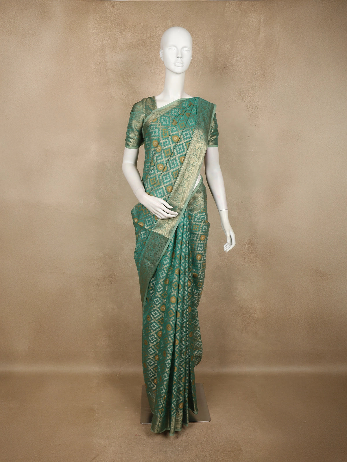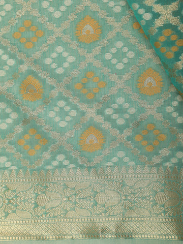 Teal Green Ikat-Style Woven Design Silk Cotton Saree with Gold Zari Border