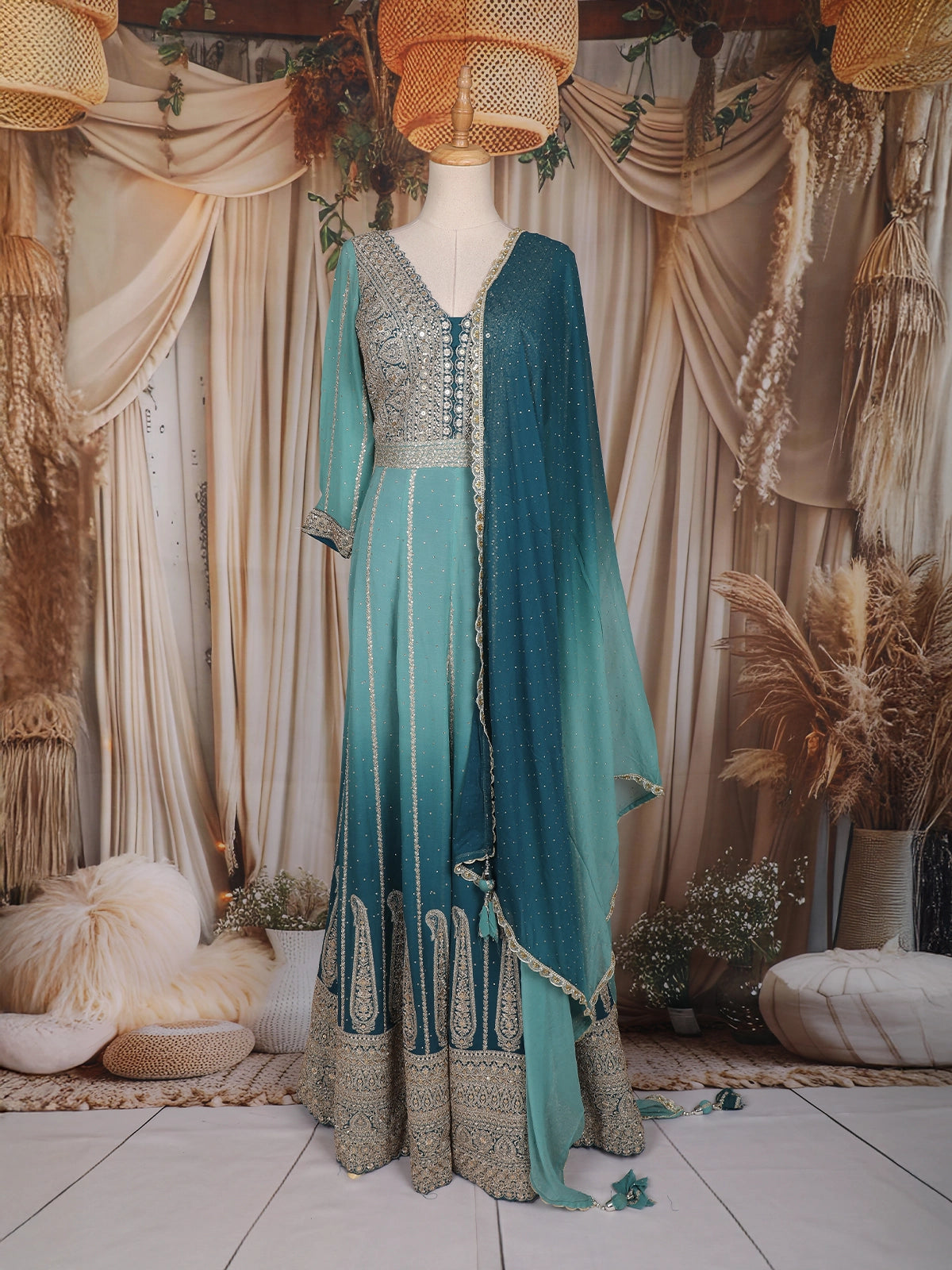 Grace your grand celebrations with unmatched elegance in this stunning Teal Green Ombre Georgette Anarkali Gown, crafted to blend royal charm with contemporary finesse. The gown features a mesmerizing ombre transition from aqua green to deep teal, creating a fluid, dreamy effect that enhances the natural flare and flow of the silhouette.