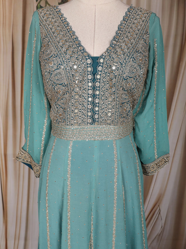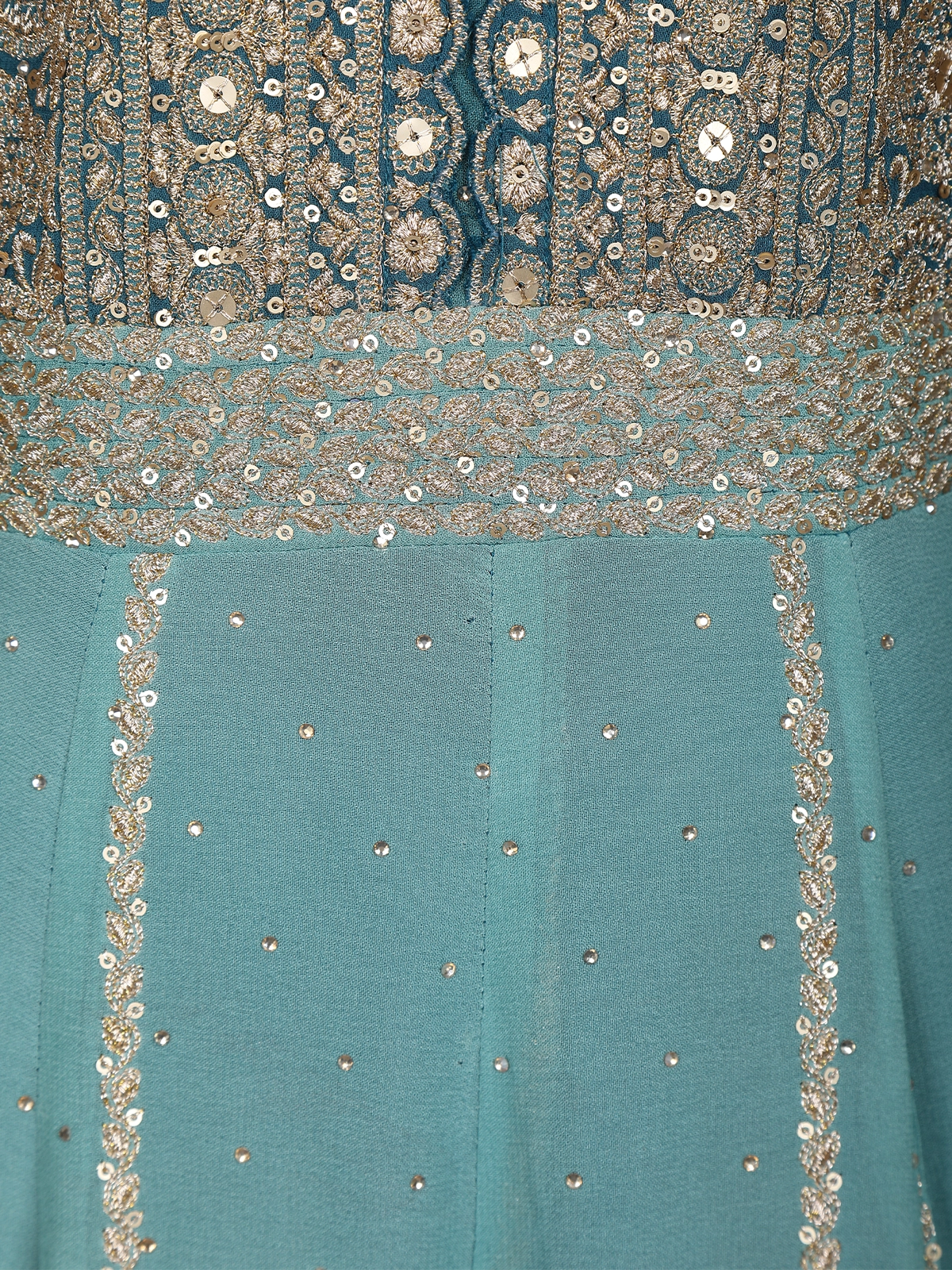 Teal Green Ombre Sequins and Zari Embroidered Design Georgette Anarkali Gown with Dupatta