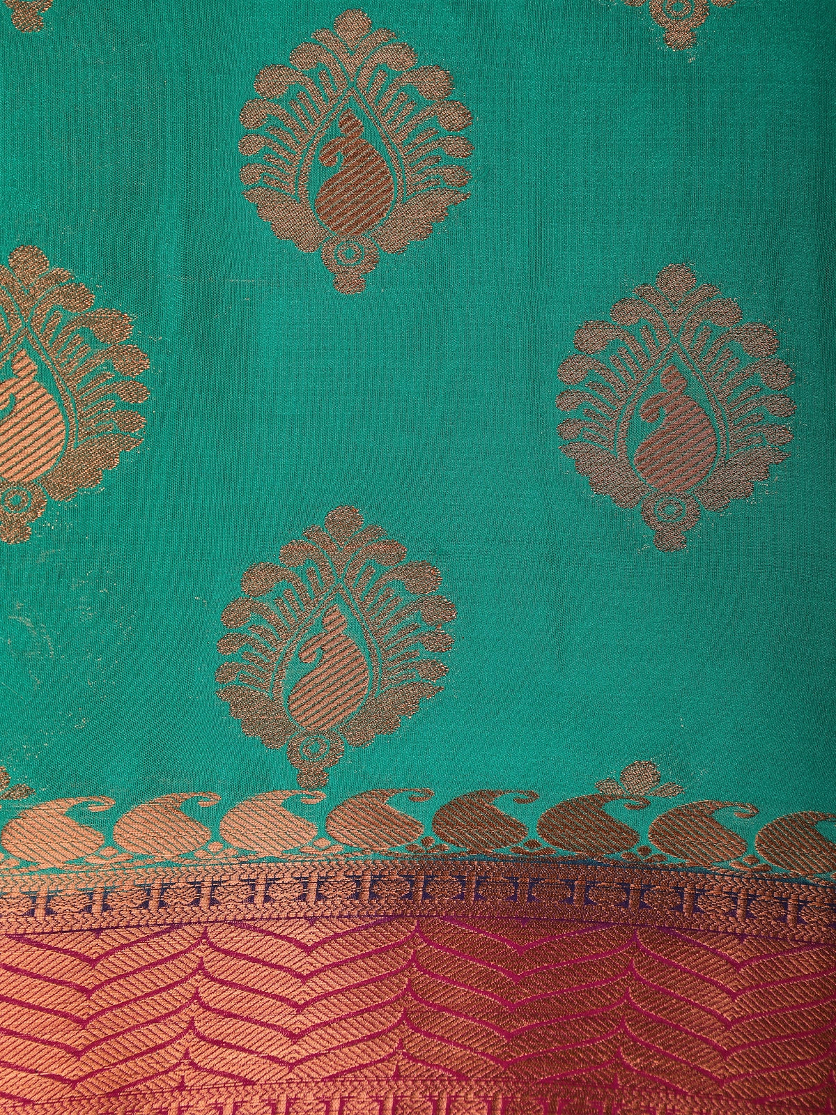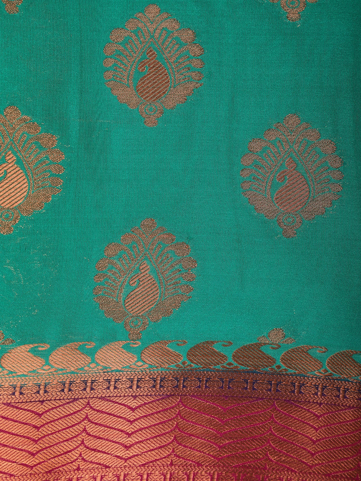 Teal Green Paisley Woven Banarasi Silk Saree With Contrast Border