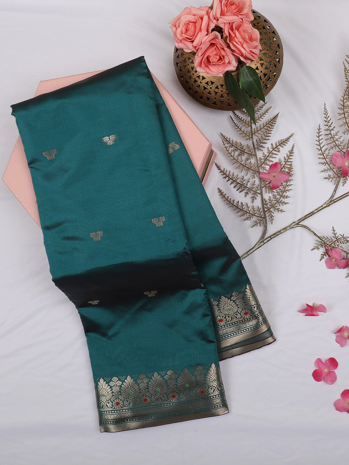 Teal Green Butta Woven Design Soft Silk Saree with Silver Zari Floral Border