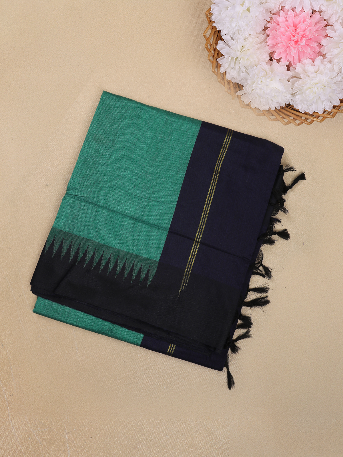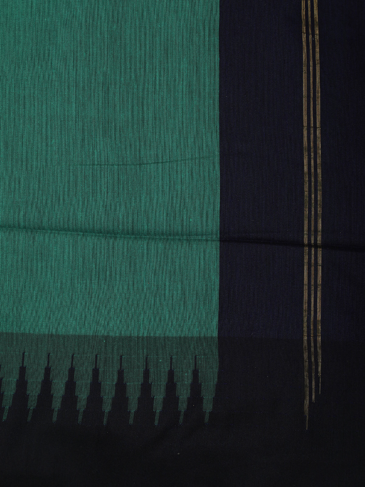 Teal Green Solid Design Kalyani Cotton Saree with Contrast Temple Border