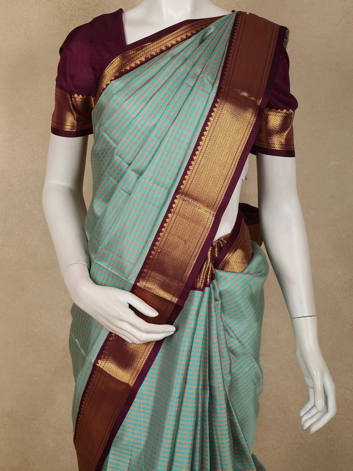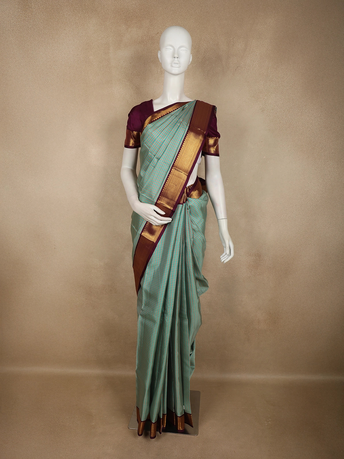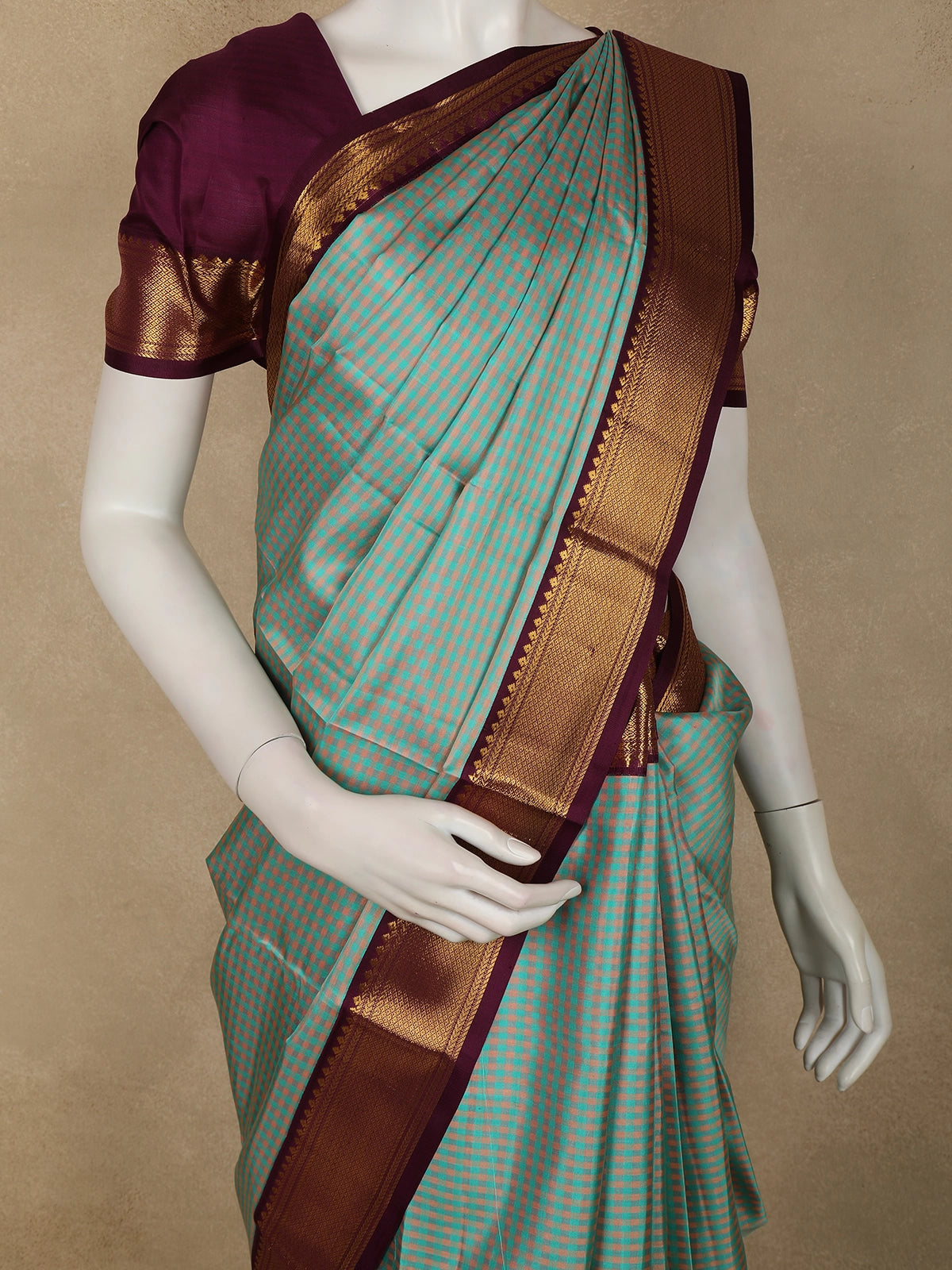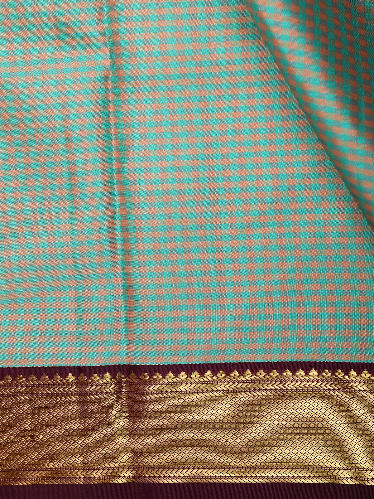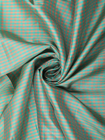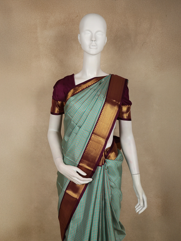 Teel Green Mini Checked Woven Design Pure Kanchipuram Silk Saree with Contrast Zari Border