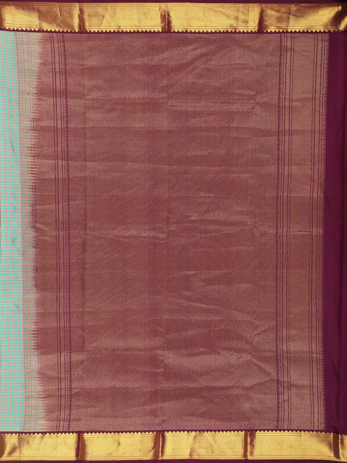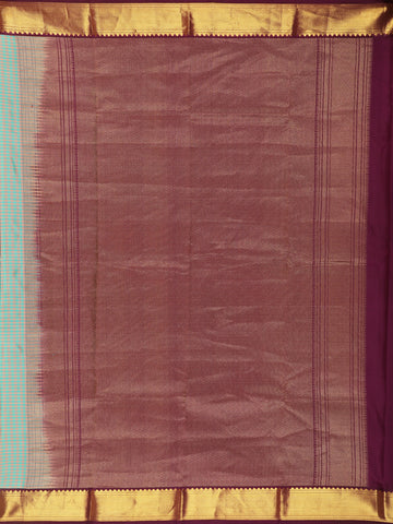 Enhancing the understated body is a striking contrast zari border in a deep chocolate brown tone, richly highlighted with antique gold zari. The bold border adds structure and regal charm, creating a beautiful contrast against the cool teal base. The coordinated pallu carries forward the same zari detailing, completing the saree with timeless sophistication.
