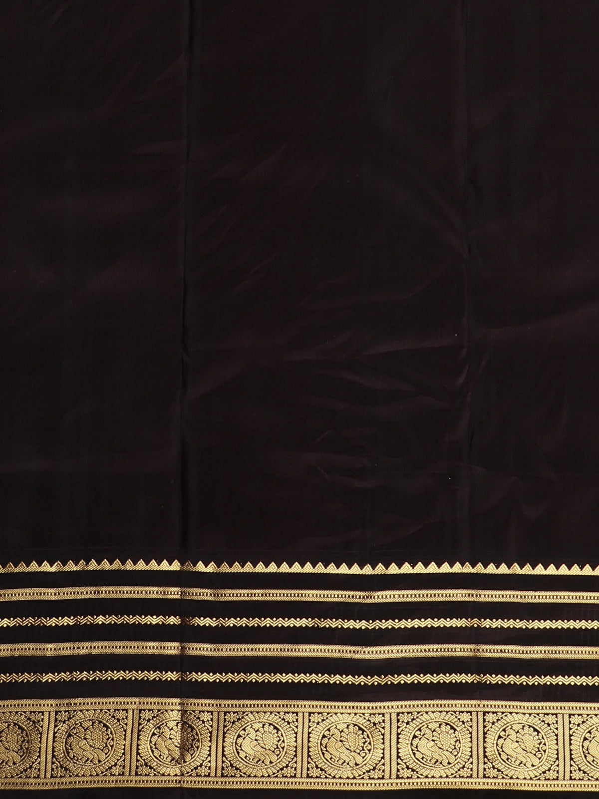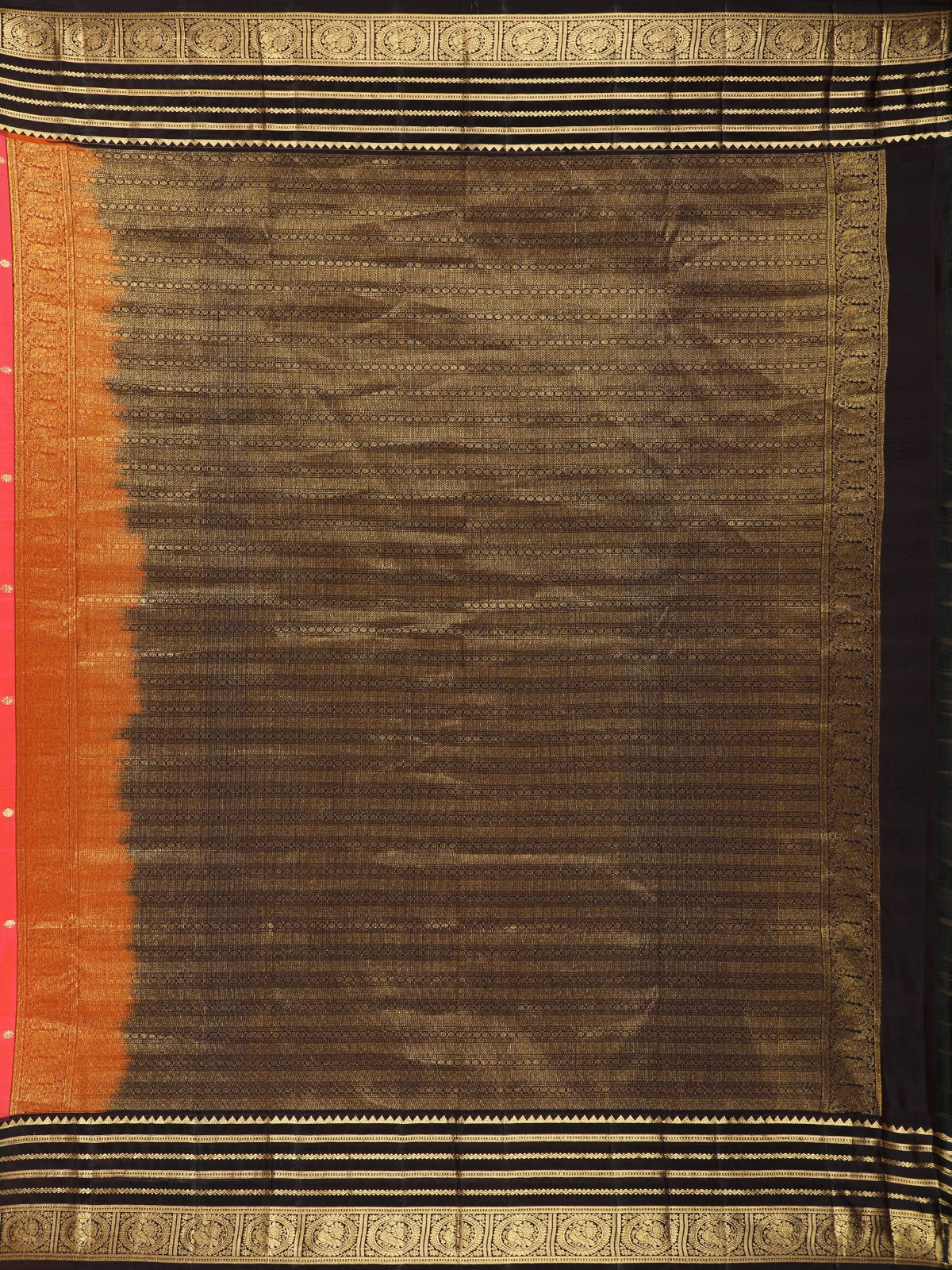The saree is elevated by a striking contrast peacock motif zari border, woven in deep black and richly highlighted with antique gold zari. The intricately detailed peacock motifs—symbols of grace and beauty—are complemented by classic geometric zari patterns, lending the saree a powerful regal presence. The richly woven pallu completes the look with heritage-inspired grandeur.