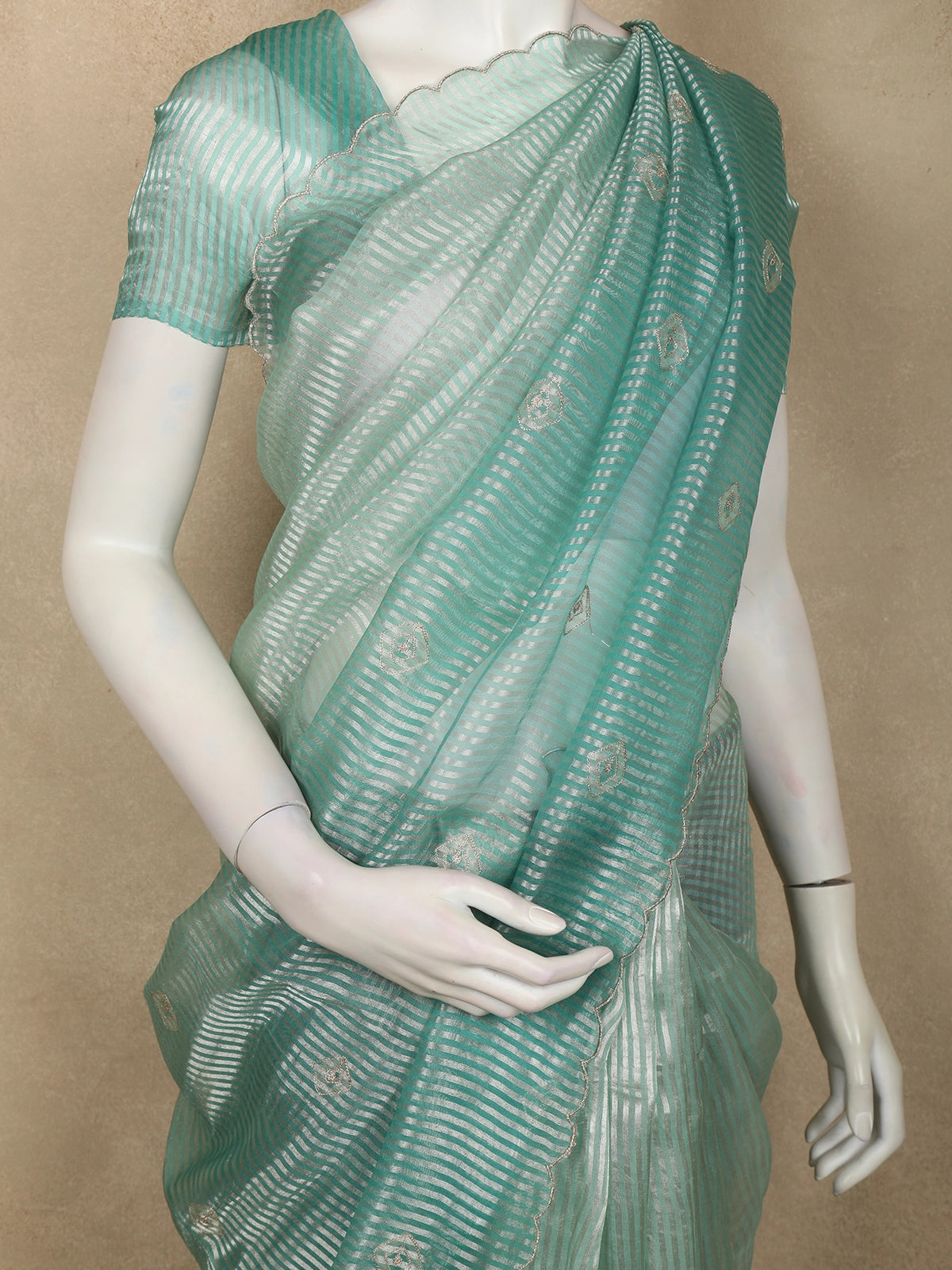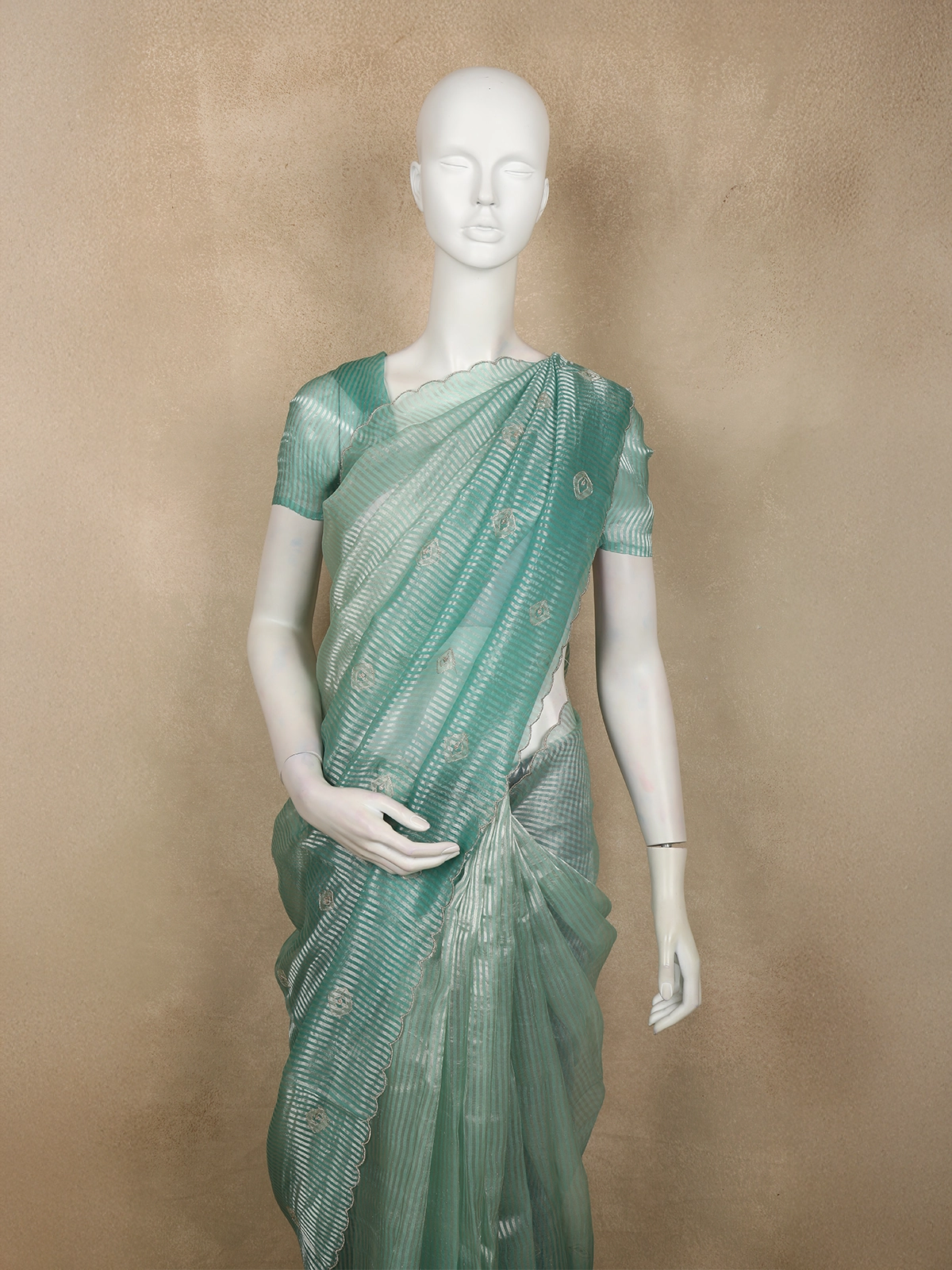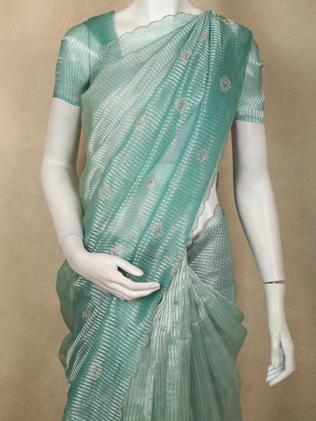 A standout feature of this saree is its elegant scalloped border, which beautifully frames the drape with soft, curved detailing. The scalloped edging adds a graceful and contemporary finish, perfectly complementing the fine embroidered accents and enhancing the saree’s overall charm.