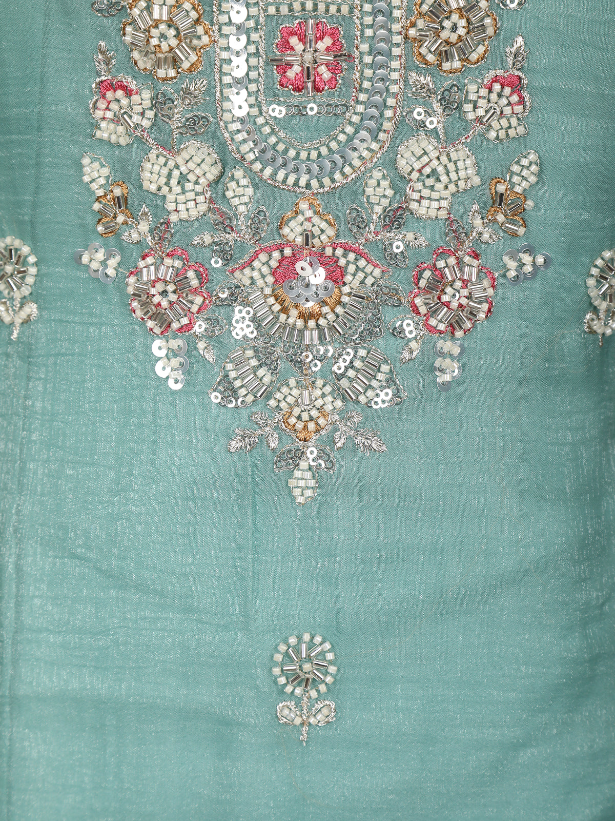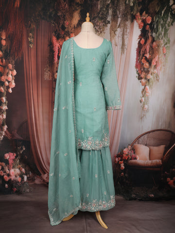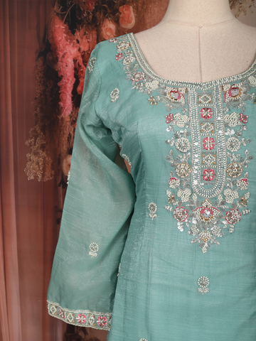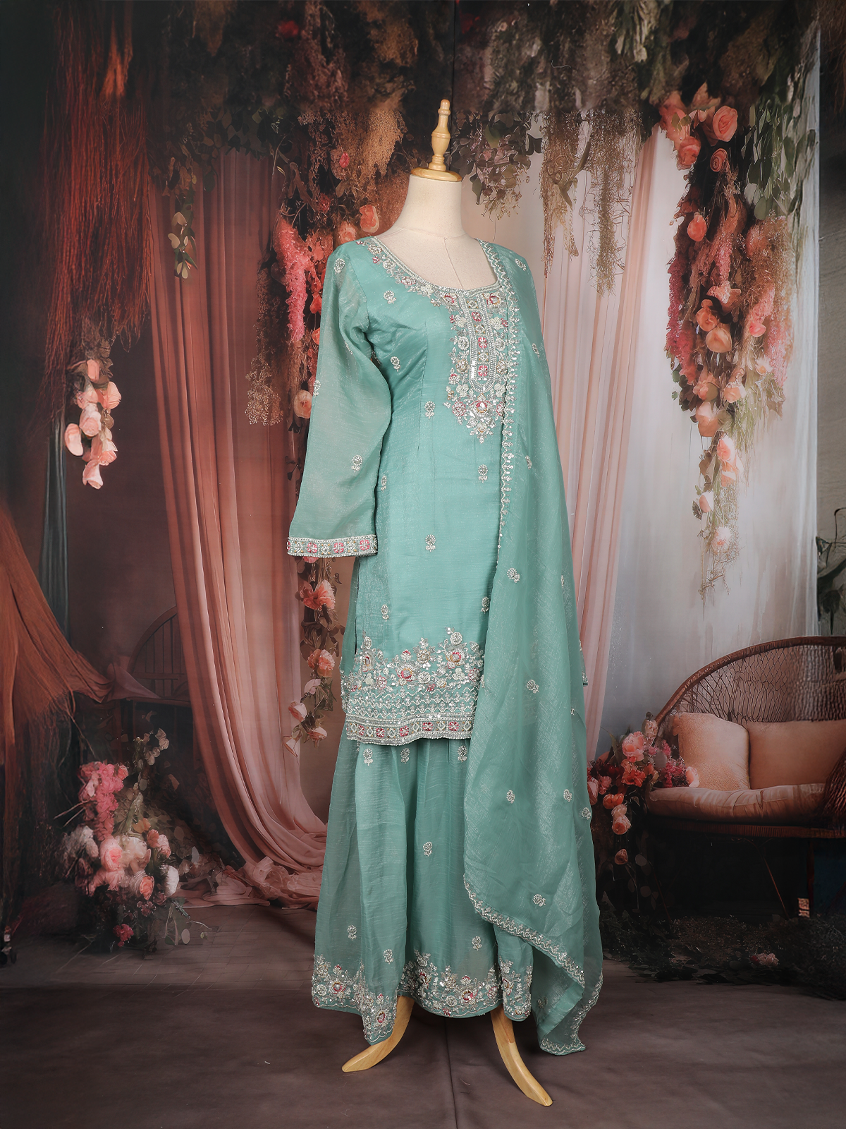 Elegant and festive, this turquoise blue sharara suit is crafted from premium tissue silk, offering a graceful sheen and luxurious feel. The outfit is adorned with delicate floral embroidery enhanced with shimmering sequins, adding a refined sparkle that elevates its overall appeal.