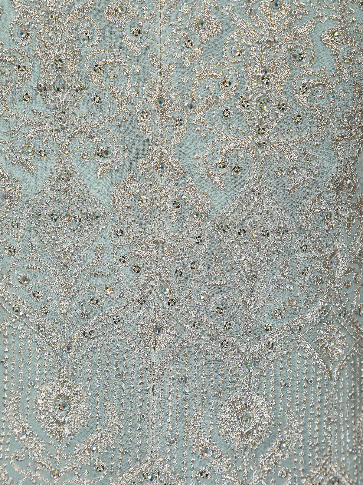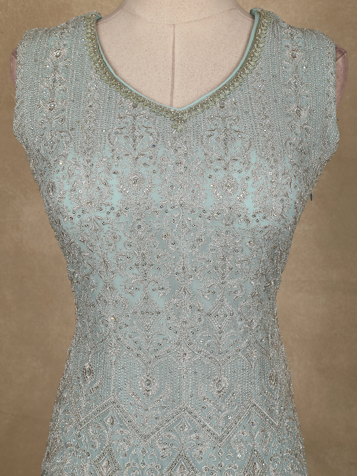Step into the spotlight with this Turquoise Green Sequins Embroidered Georgette Palazzo Suit, designed to exude grace and glamour in every detail. The sleeveless kurta features a flattering V-neckline, beautifully accentuated with dense silver sequins and thread embroidery forming intricate floral and geometric motifs. Crafted from premium georgette, the fabric drapes effortlessly, lending a soft sheen and fluid movement.
