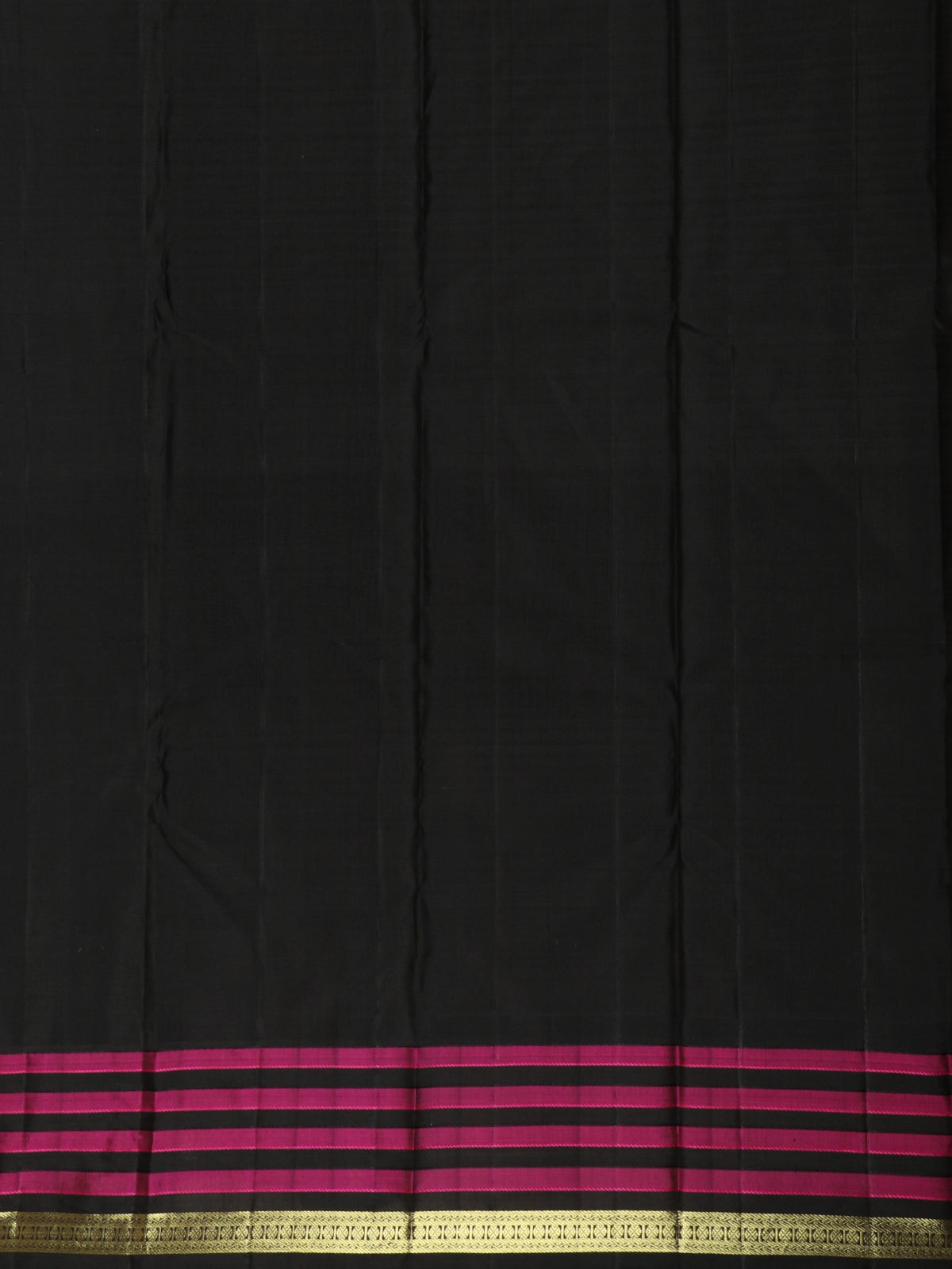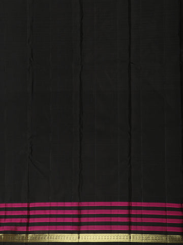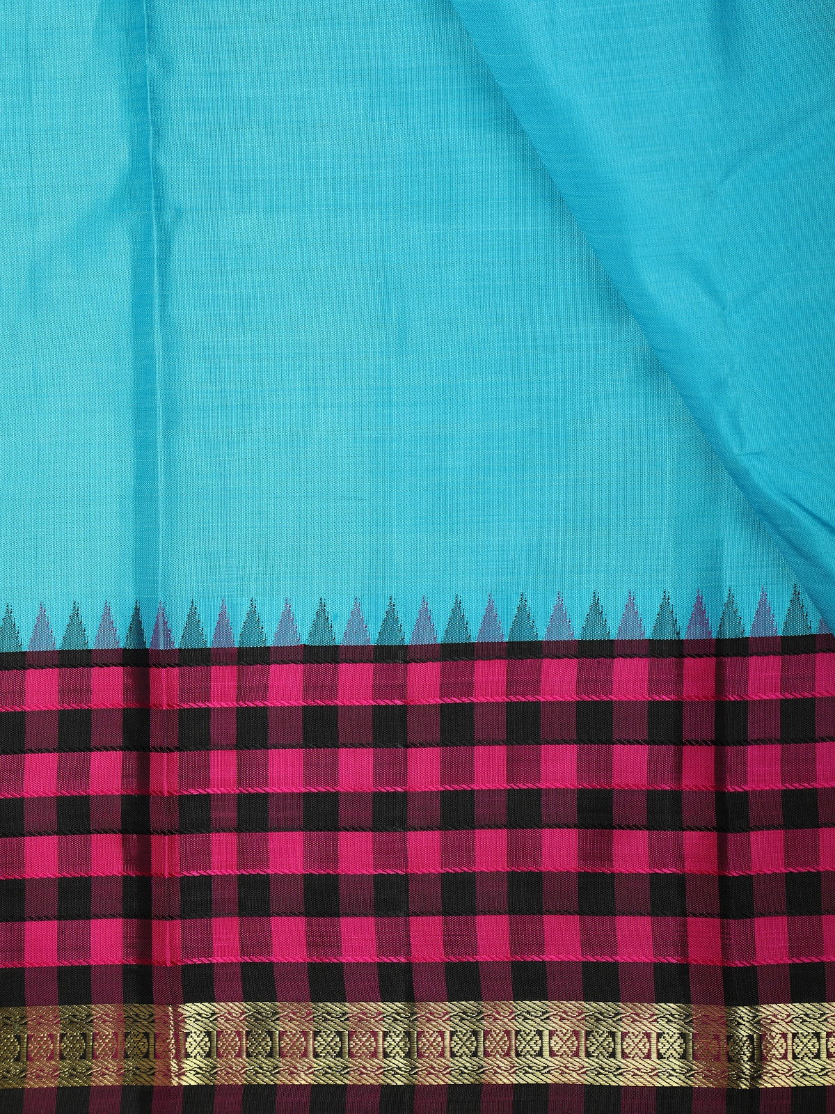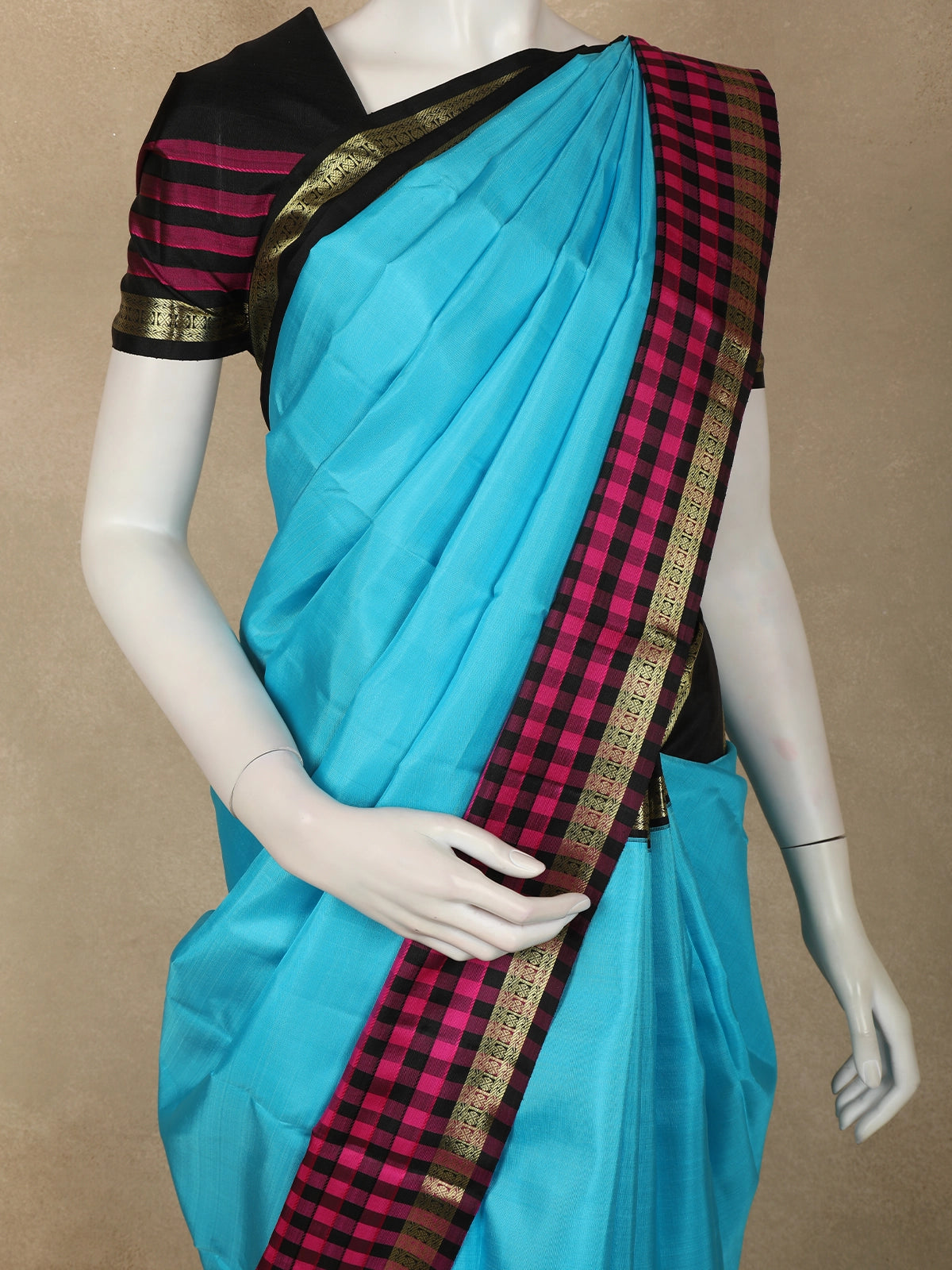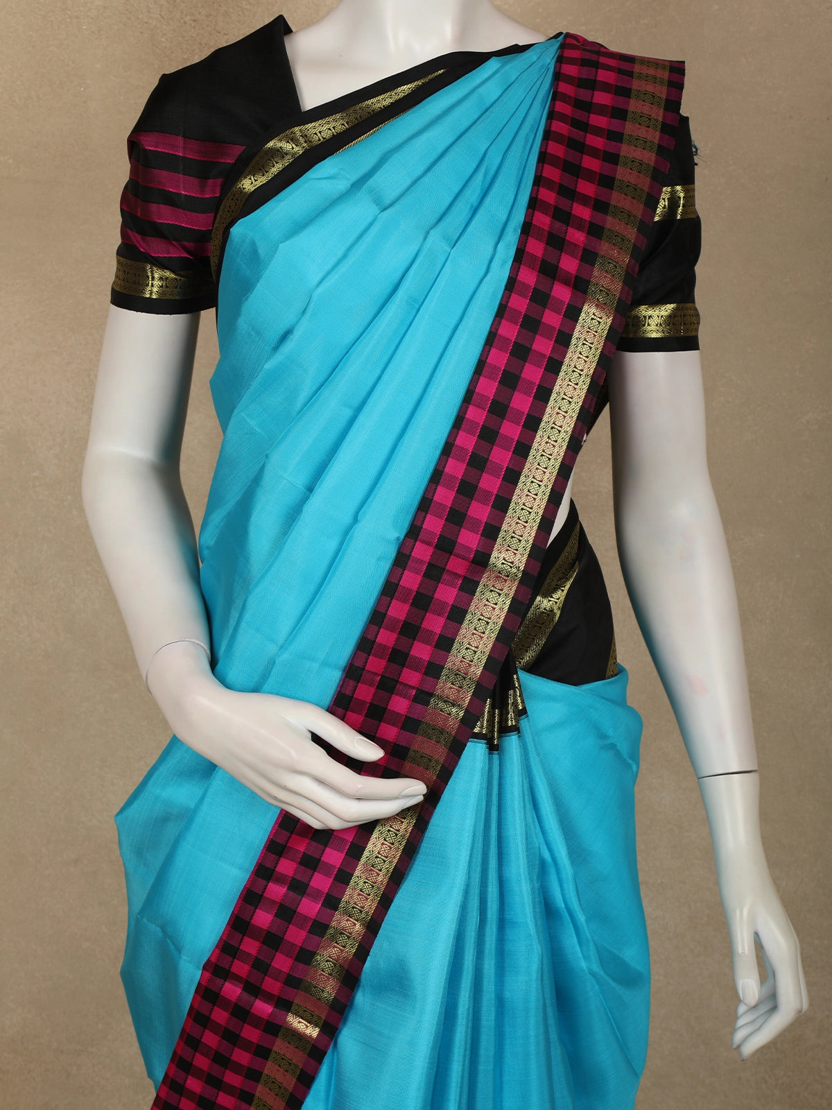 The saree is beautifully enhanced with a contrast border adorned with classic magenta checks and antique gold zari detailing, adding depth and character to the overall look. The neatly woven border frames the saree gracefully, while the contrasting pallu lends a refined South Indian charm.