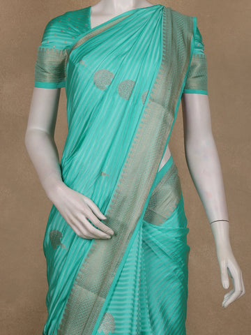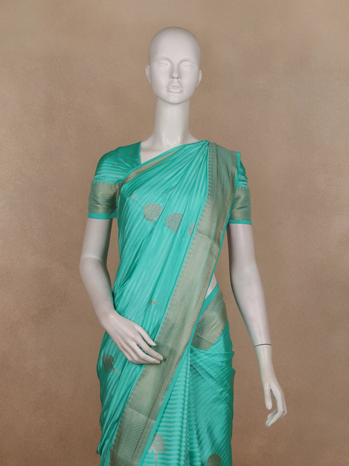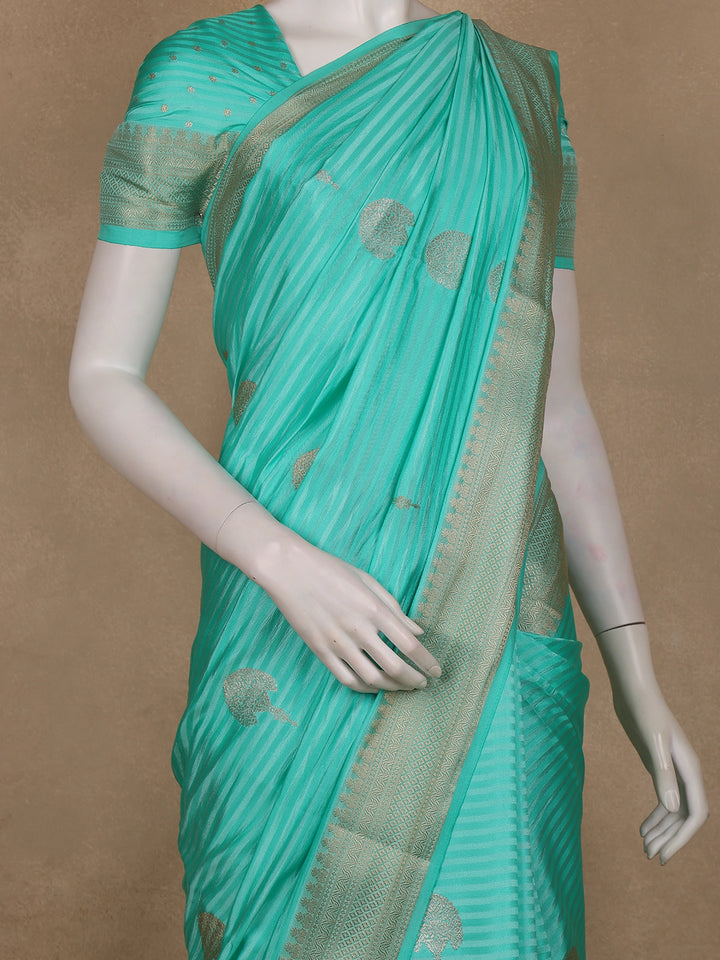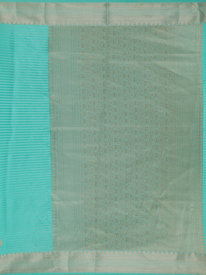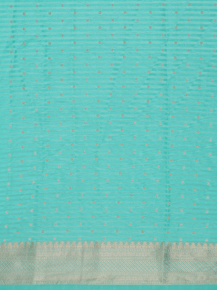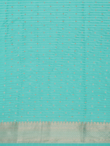 Turquoise Blue Striped Zari Butta Woven Design Semi Banarasi Saree with Contrast Border