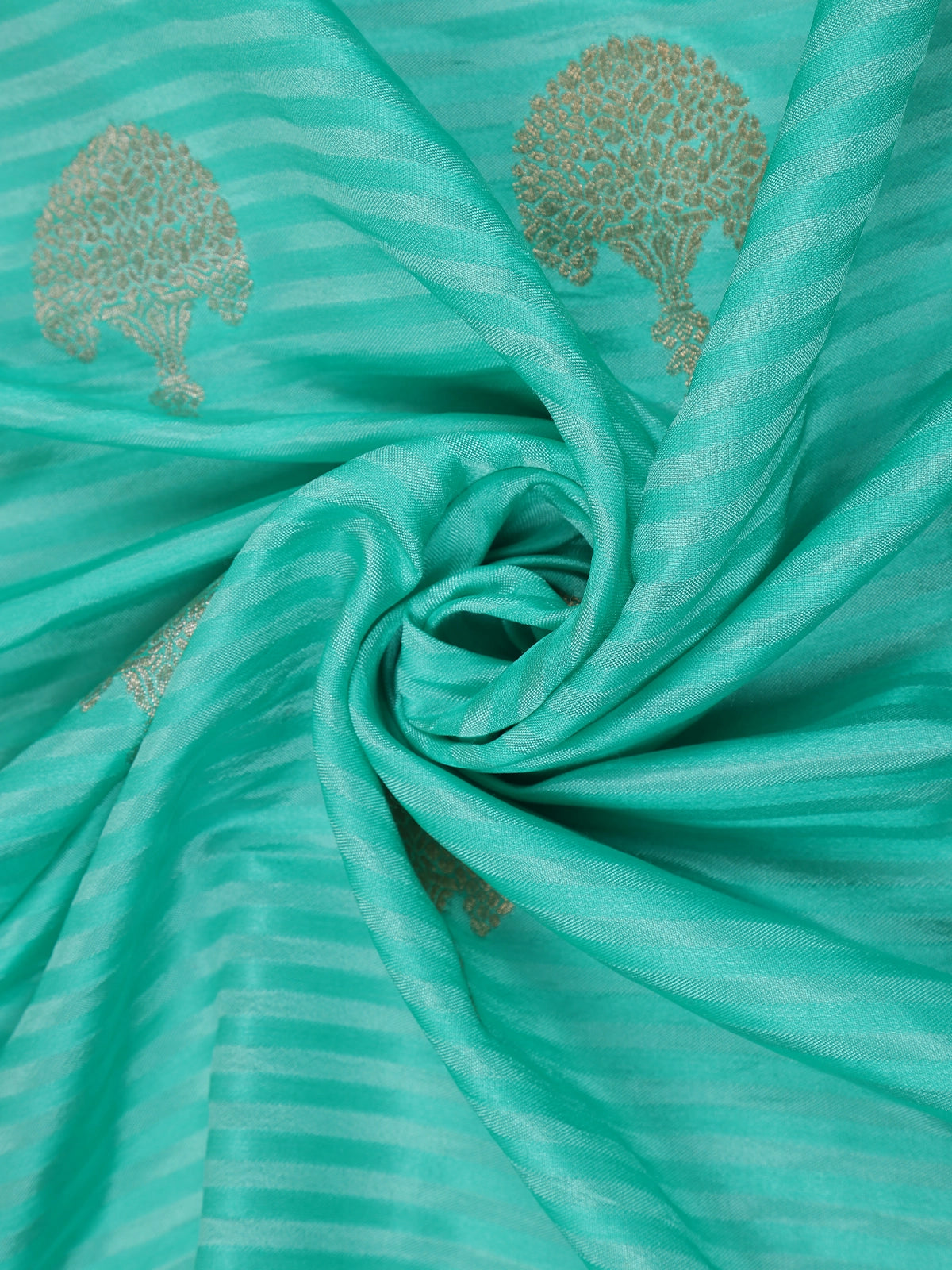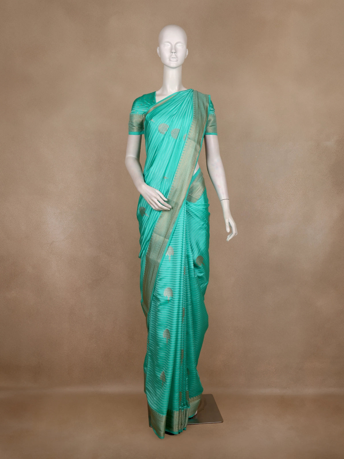 Make a refined style statement with this stunning Turquoise Blue Semi Banarasi Saree, highlighted with elegant striped weaving and delicate zari butta motifs across the body. The cool, refreshing shade of turquoise paired with the lustrous zari accents adds a graceful festive charm. The contrast border adorned with intricate Banarasi-inspired detailing enhances its traditional appeal, while the rich pallu ensures a complete luxurious finish. Light, drapable, and glamorous — this saree is the perfect pick for festive occasions, weddings, cultural functions, and evening celebrations. Pair with antique gold jewelry for a classy ethnic look.