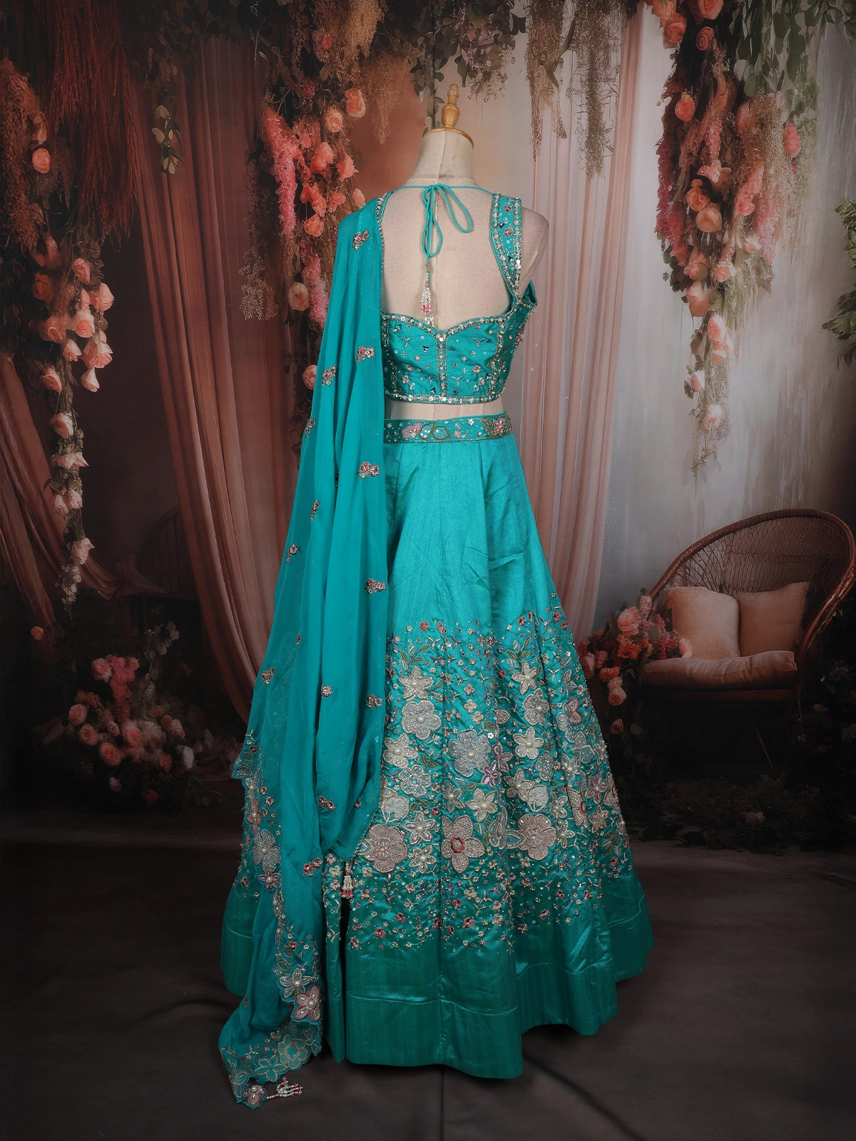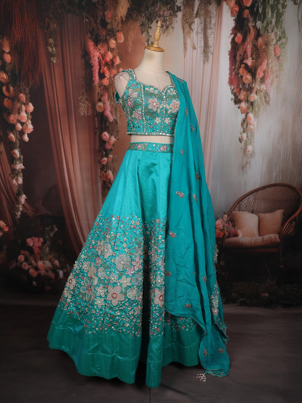 A stunning blend of elegance and craftsmanship, this turquoise lehenga set is designed to make a statement at every special occasion. The refreshing sea green hue adds a contemporary charm, while the intricate floral embroidery enhances its traditional appeal.