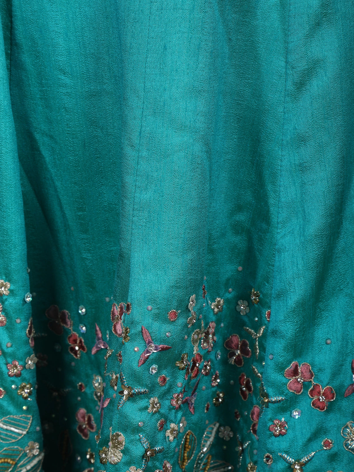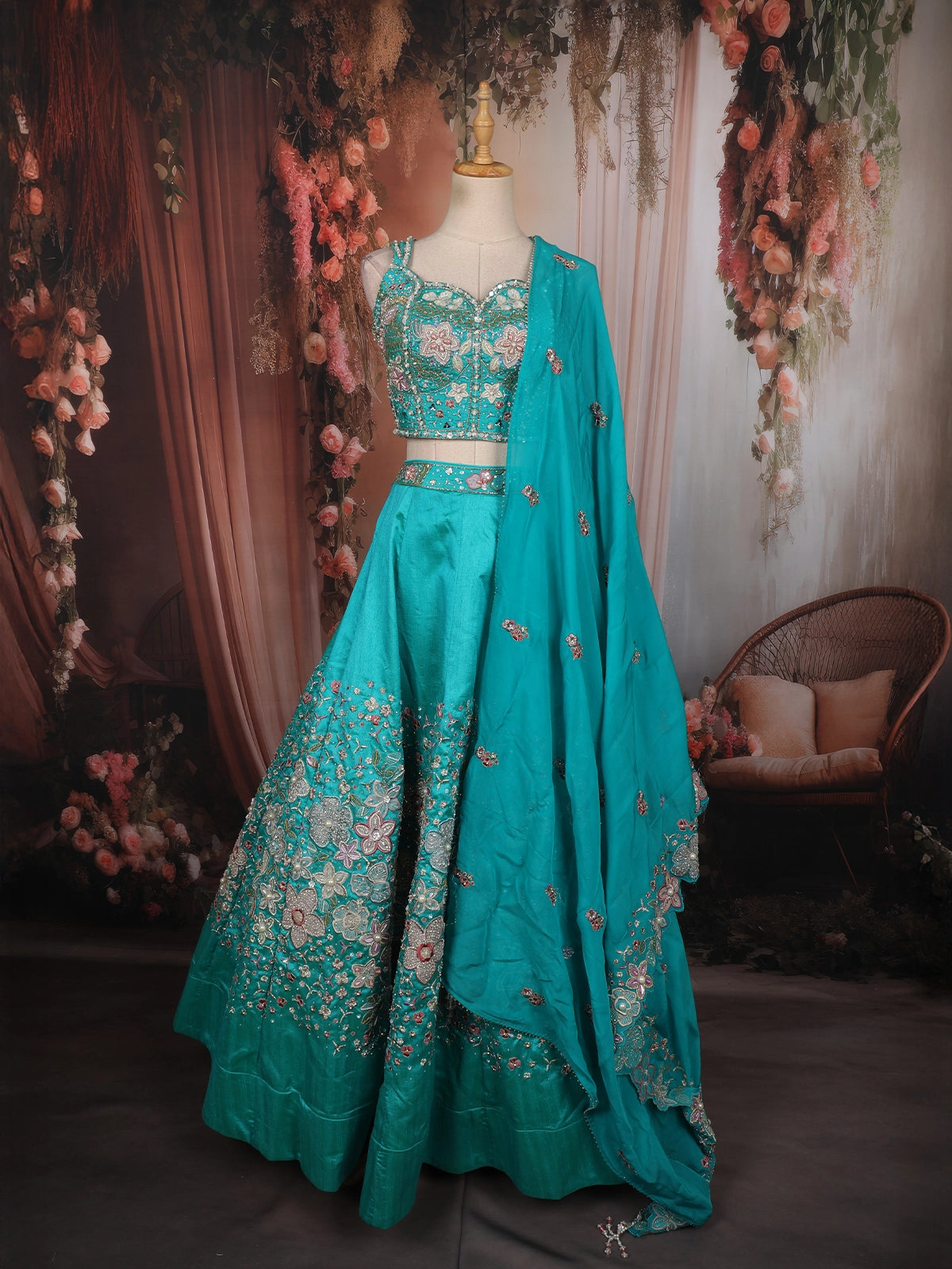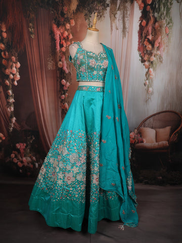 Turquoise Blue Floral Thread and Beads Embroidered Design Silk Lehenga with Dupatta