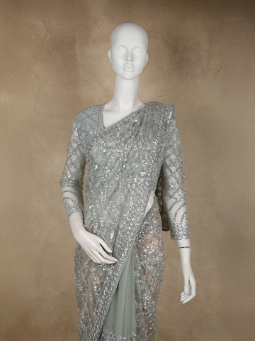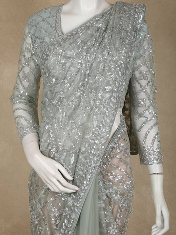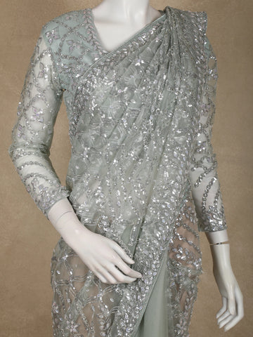 Turquoise Green Heavy Sequins and Beads Embroidered Design Net Designer Saree with Full Sleeve Blouse