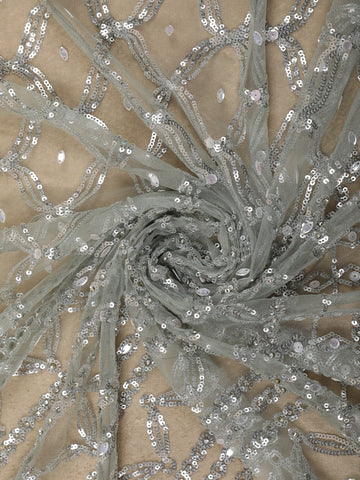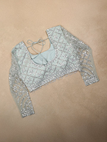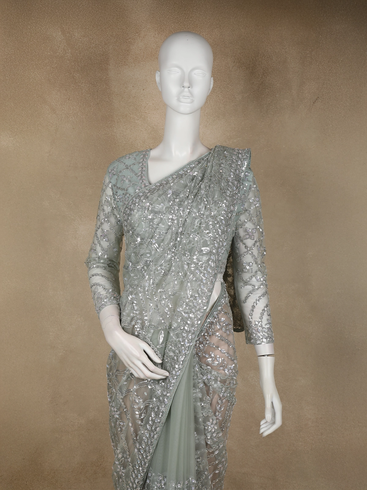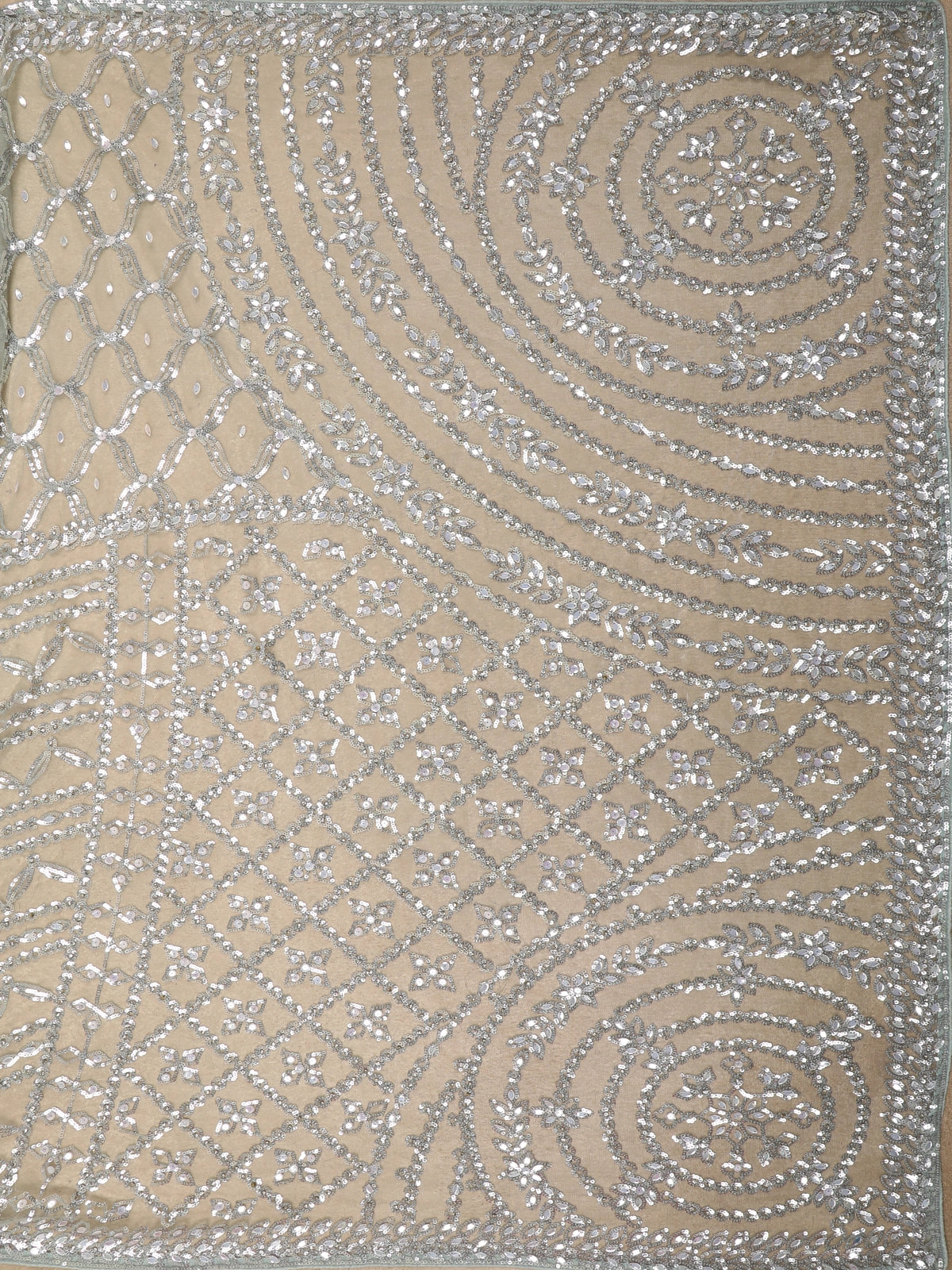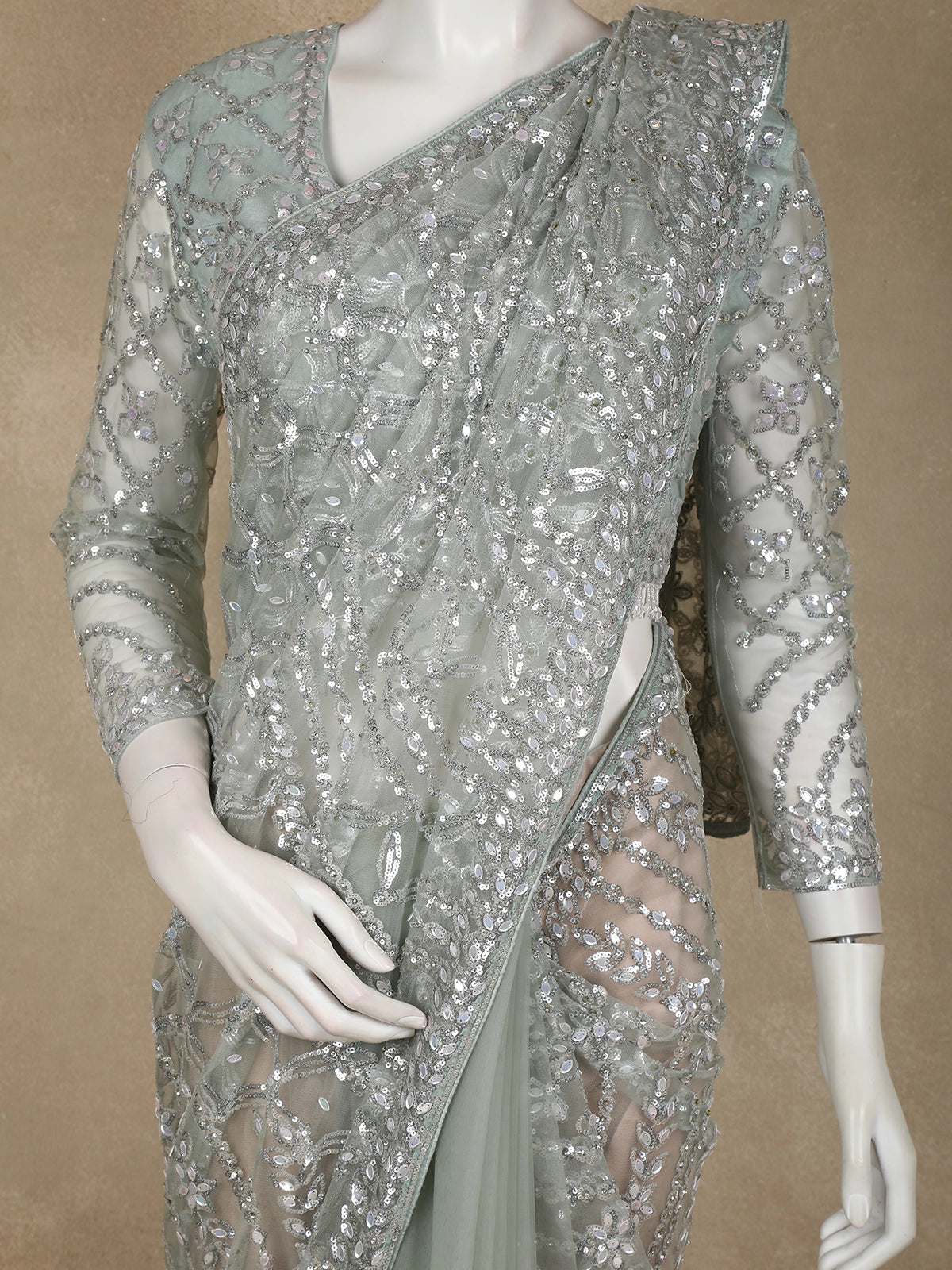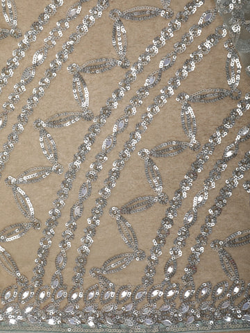 Designed in delicate sheer net fabric, the saree is lavishly adorned with heavy sequin embroidery, intricately arranged in elegant floral and vine-inspired patterns. The dense embellishment creates a dazzling effect while maintaining a refined balance through meticulous craftsmanship. The richly embroidered scalloped border enhances the drape, adding definition and opulence.
