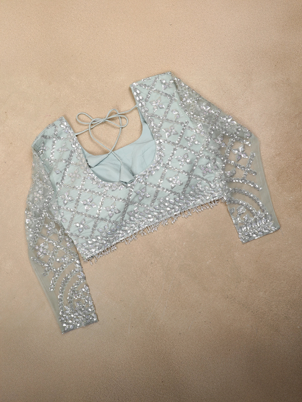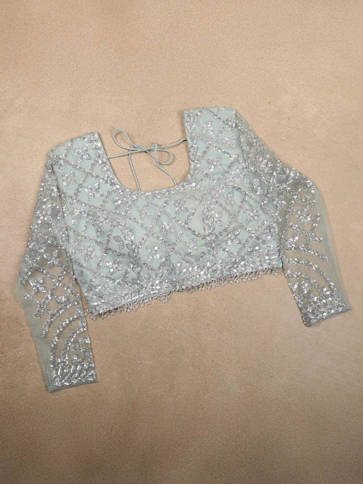Paired with a matching full-sleeve embroidered blouse, the ensemble delivers a contemporary yet regal silhouette. The blouse features coordinated sequin and thread work, offering coverage with elegance and enhancing the overall grandeur of the outfit.