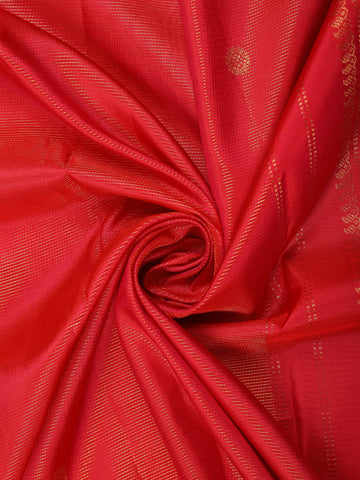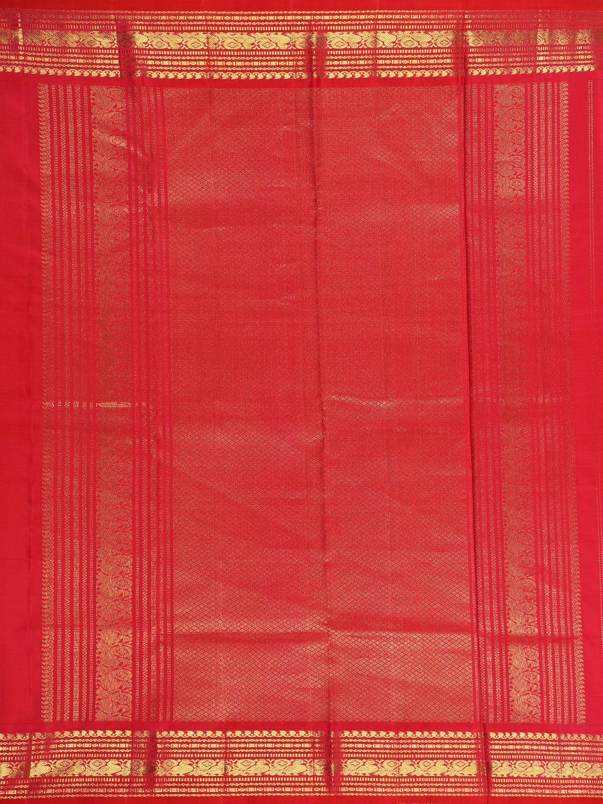 Drape yourself in timeless South Indian grandeur with this Vermilion Red Floral Butta Woven Design Pure Kanchipuram Silk Saree, a classic piece that celebrates heritage craftsmanship. The saree features a radiant vermilion red body, woven with fine horizontal gold zari lines that add depth, texture, and a subtle, elegant sheen.
