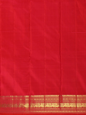 The highlight of this saree is its opulent peacock zari border, intricately woven with majestic peacock motifs and traditional patterns in rich gold zari. The border adds a bold, statement finish, symbolising prosperity and elegance—an iconic hallmark of authentic Kanchipuram silks.
