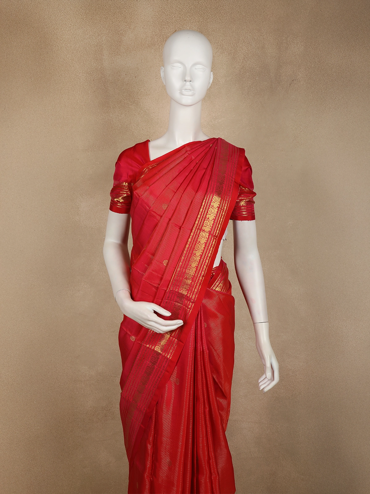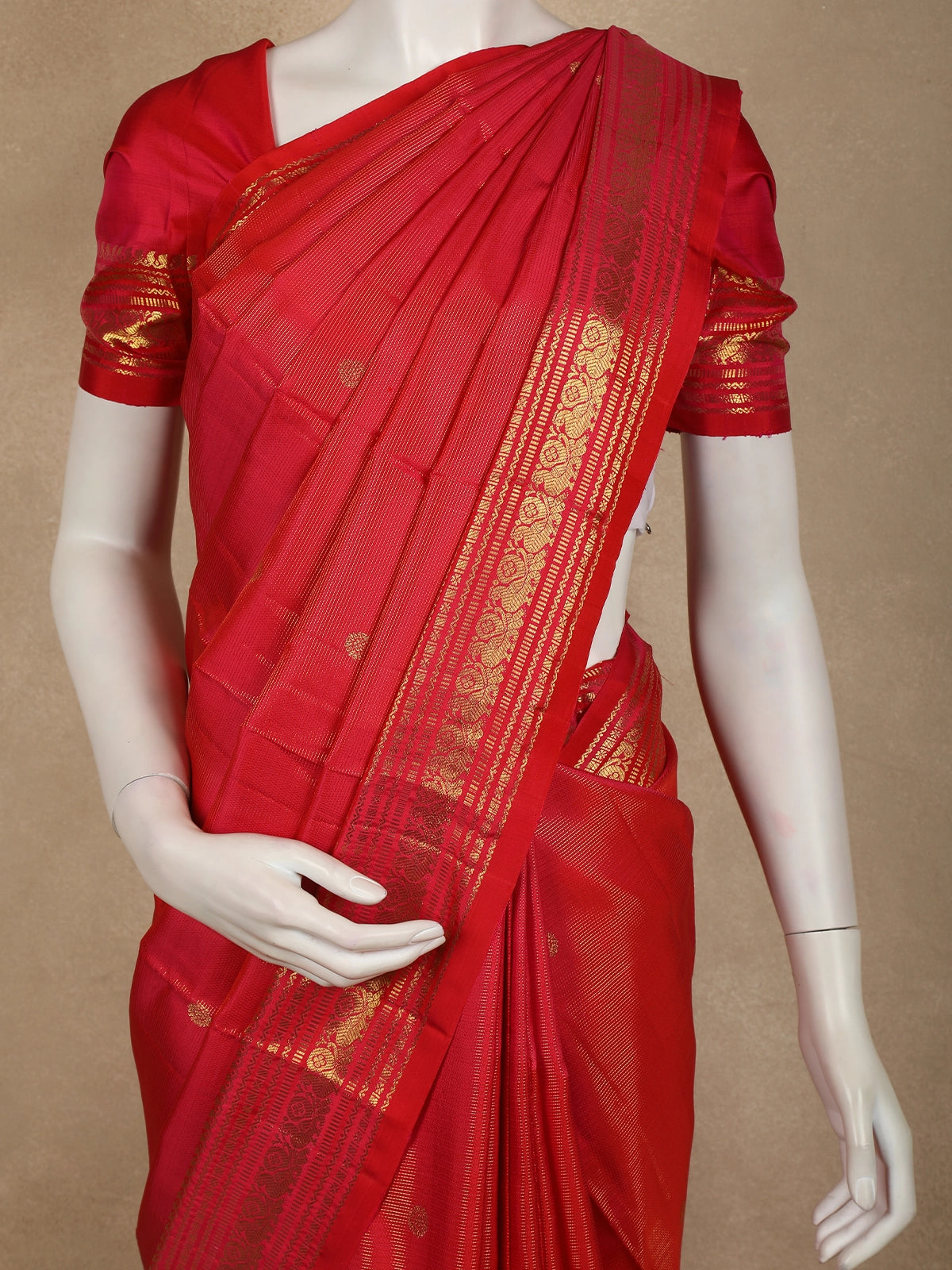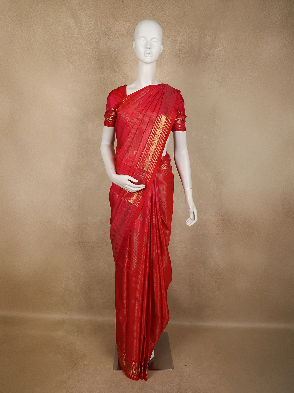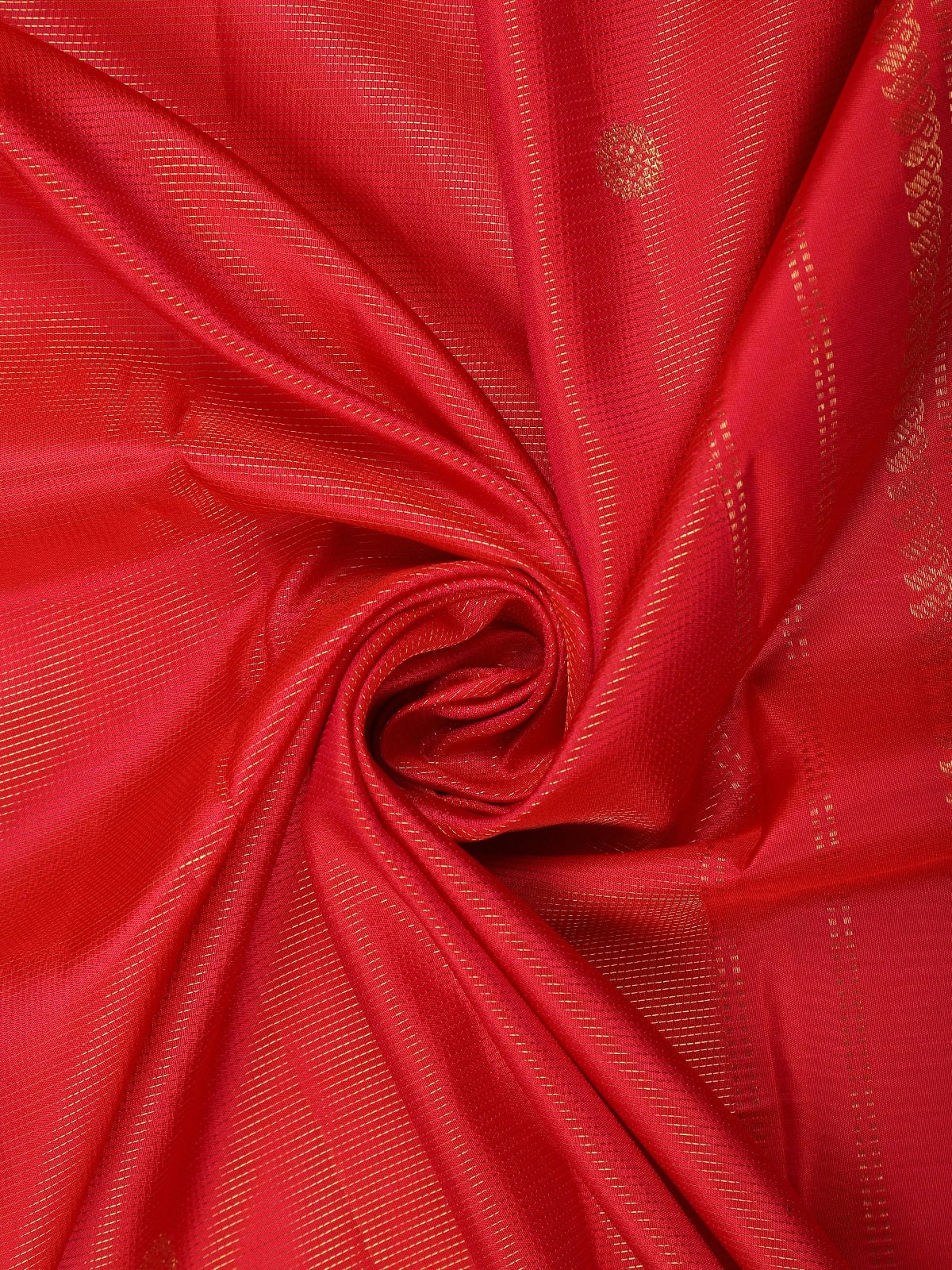 Delicately placed floral butta motifs in shimmering gold zari accentuate the body, lending a graceful rhythm to the rich red base without overpowering its traditional charm. The silk’s natural lustre enhances the vibrancy of the colour, creating a regal visual appeal.