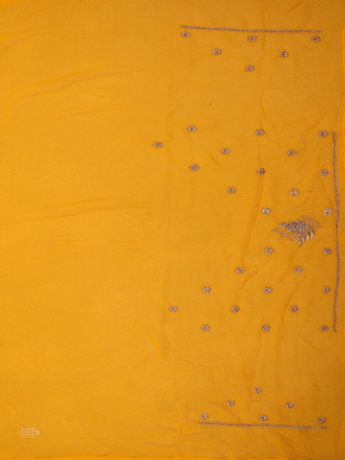 The saree is adorned with intricate floral zari embroidery, artfully spread across the drape to create a harmonious and elegant pattern. Delicate stone embellishments are thoughtfully embedded within the embroidery, adding a refined shimmer that enhances the saree’s festive appeal without overwhelming its grace. The richly detailed embroidered border frames the saree beautifully, lending it a couture finish and highlighting the craftsmanship in every fold.