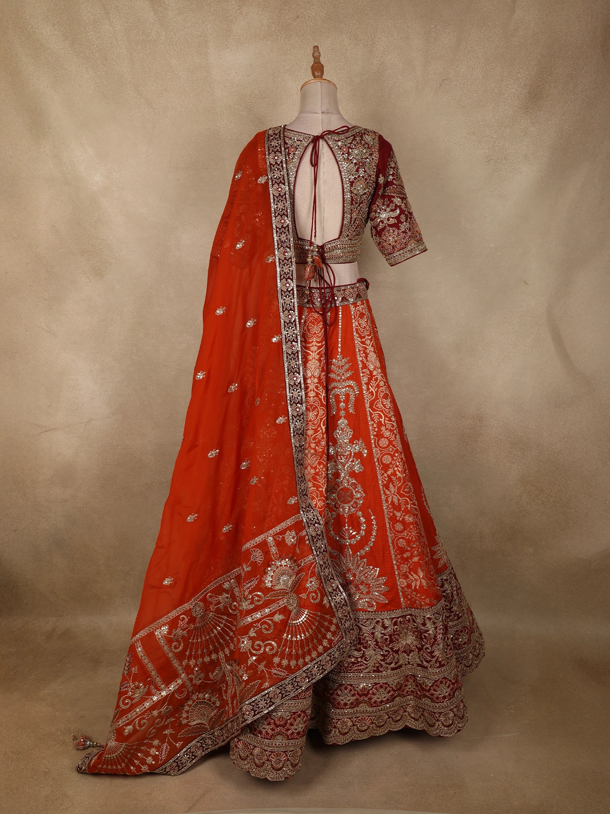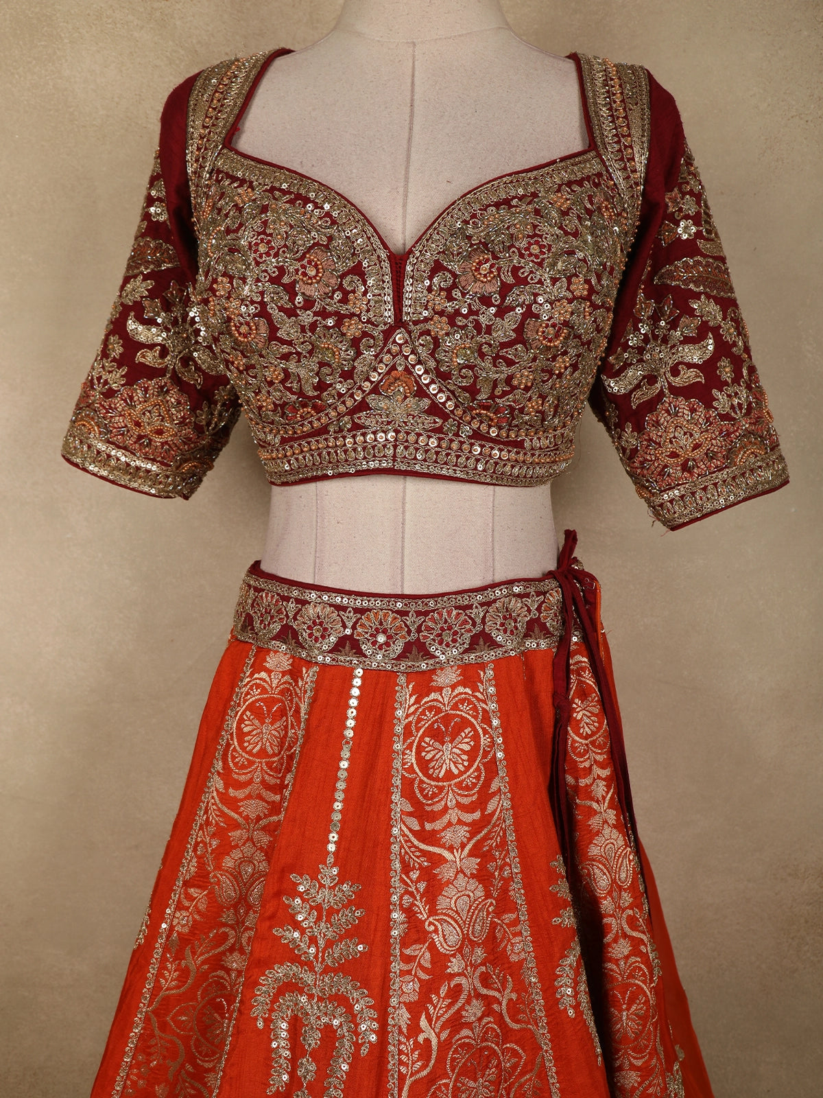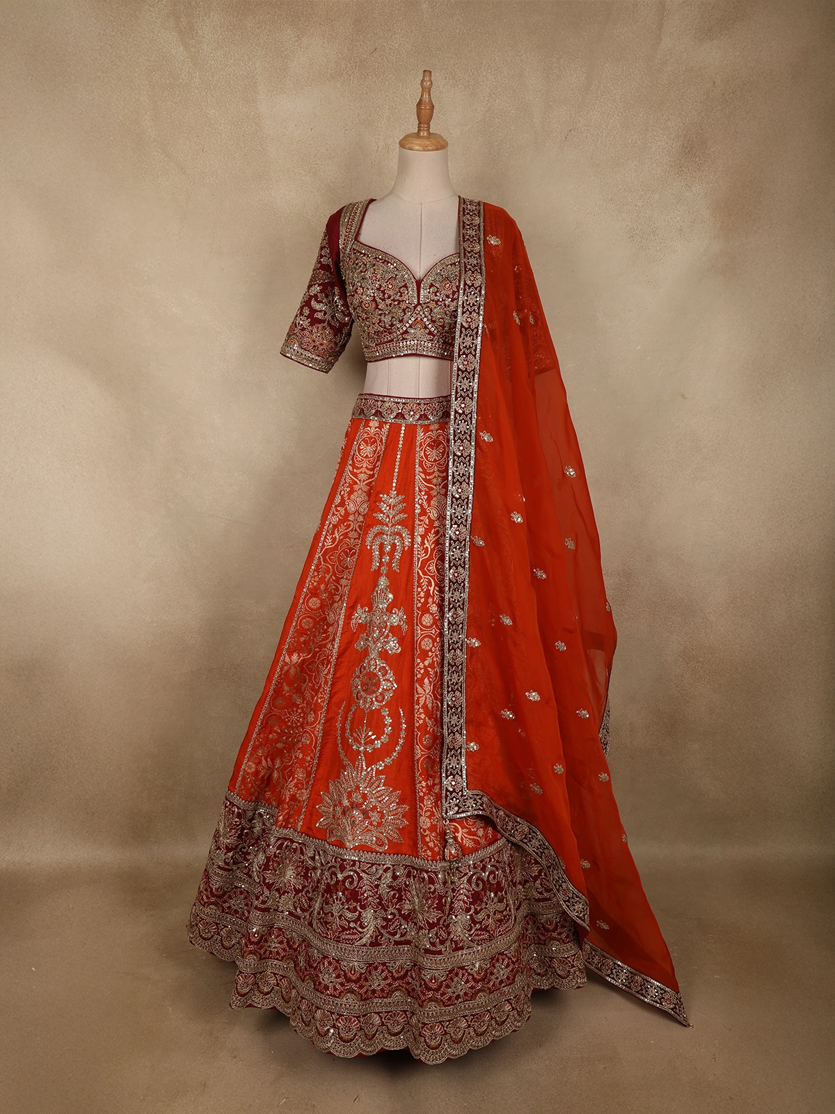 Radiating festive grandeur, this bridal lehenga is crafted in a vibrant orange Banarasi silk, a striking hue that symbolizes joy, prosperity, and celebration. The rich silk base carries a subtle natural sheen, enhancing the brightness of the orange tone while giving the ensemble a luxurious, ceremonial appeal.