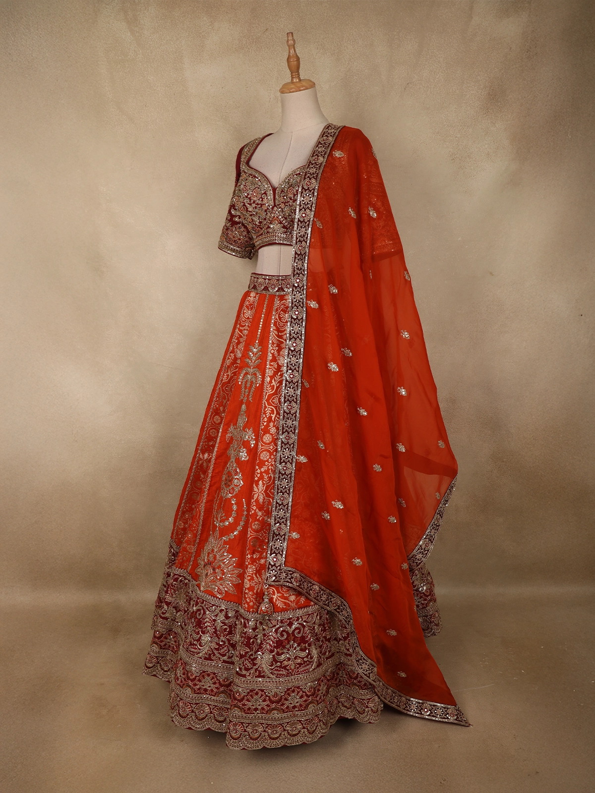 Completing the ensemble is a designer dupatta in a coordinated vibrant orange tone, accentuated with delicate sequin buttas and a richly embroidered border. The lightweight drape of the dupatta adds softness and balance, beautifully contrasting the richly embellished lehenga and blouse.