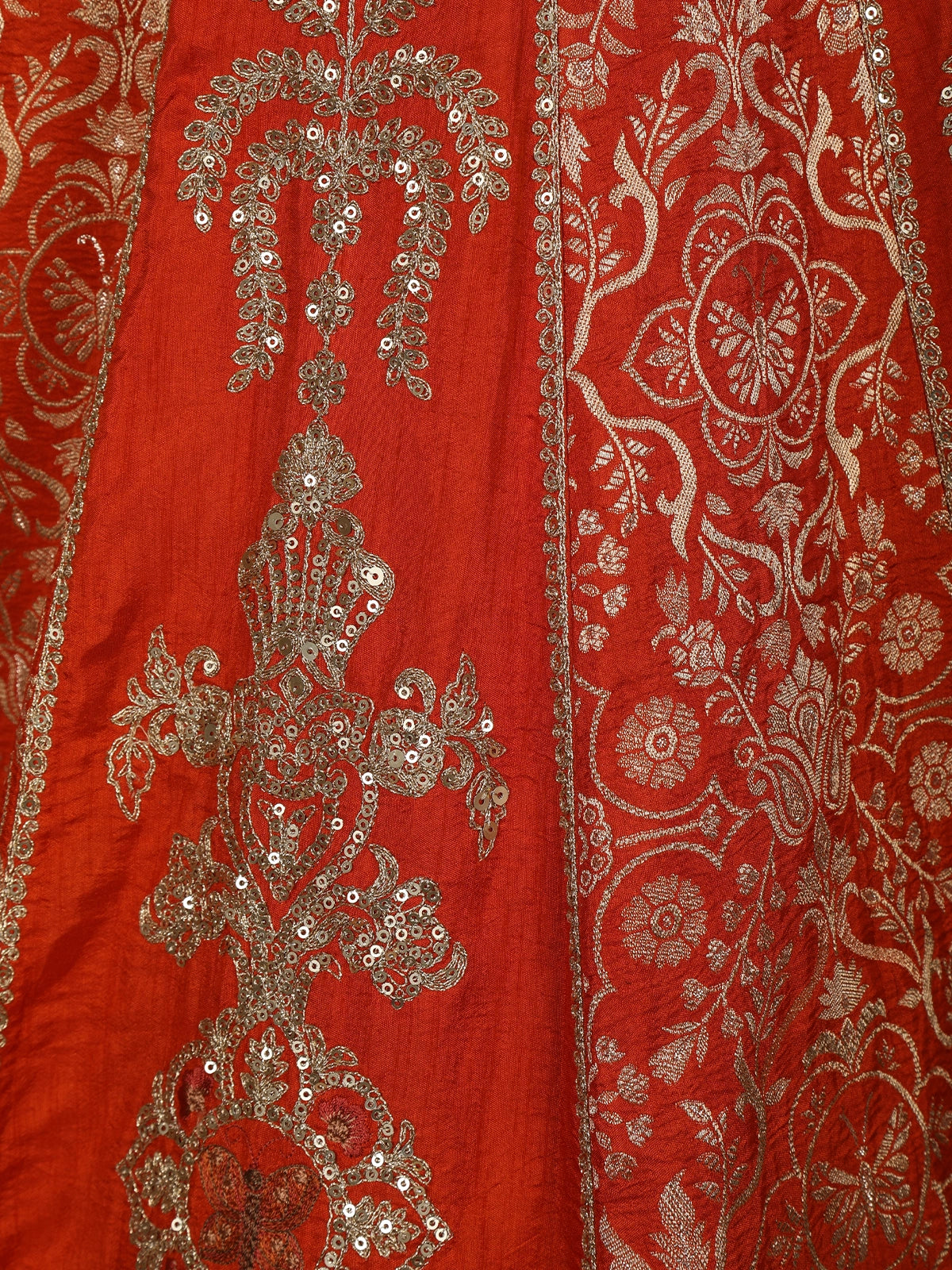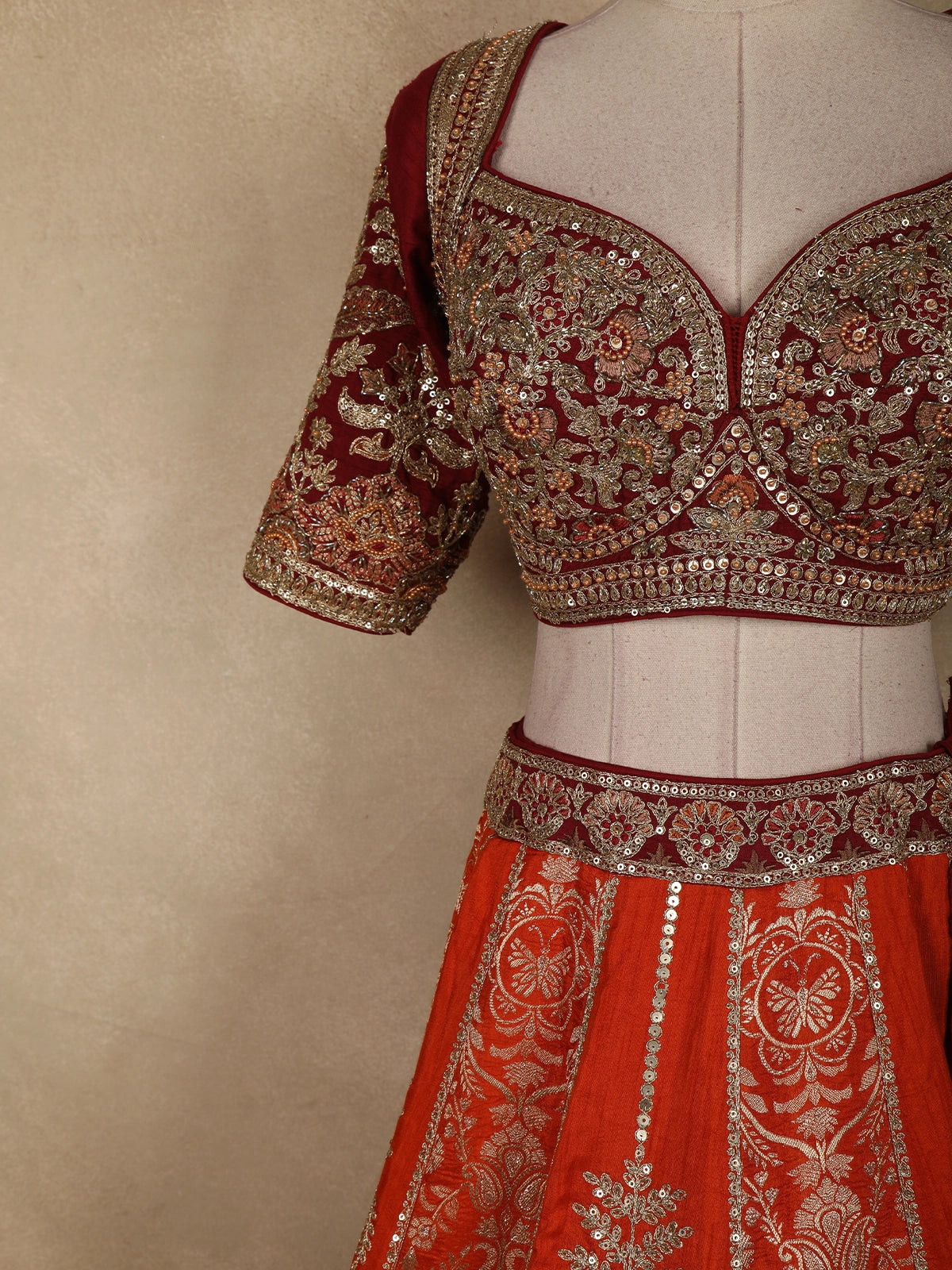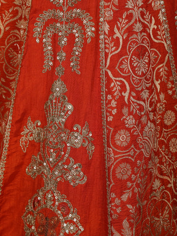 Vibrant Orange Floral Sequins and Beads Embroidered Design Banarasi Silk Bridal Lehenga with Designer Dupatta