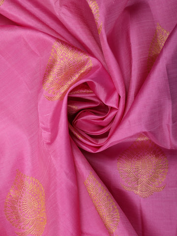 The body is adorned with delicate paisley butta motifs, intricately woven using fine gold zari, adding a graceful rhythm and festive charm to the vibrant rose pink base. These classic motifs enhance the saree’s traditional appeal while maintaining an elegant balance throughout the drape.