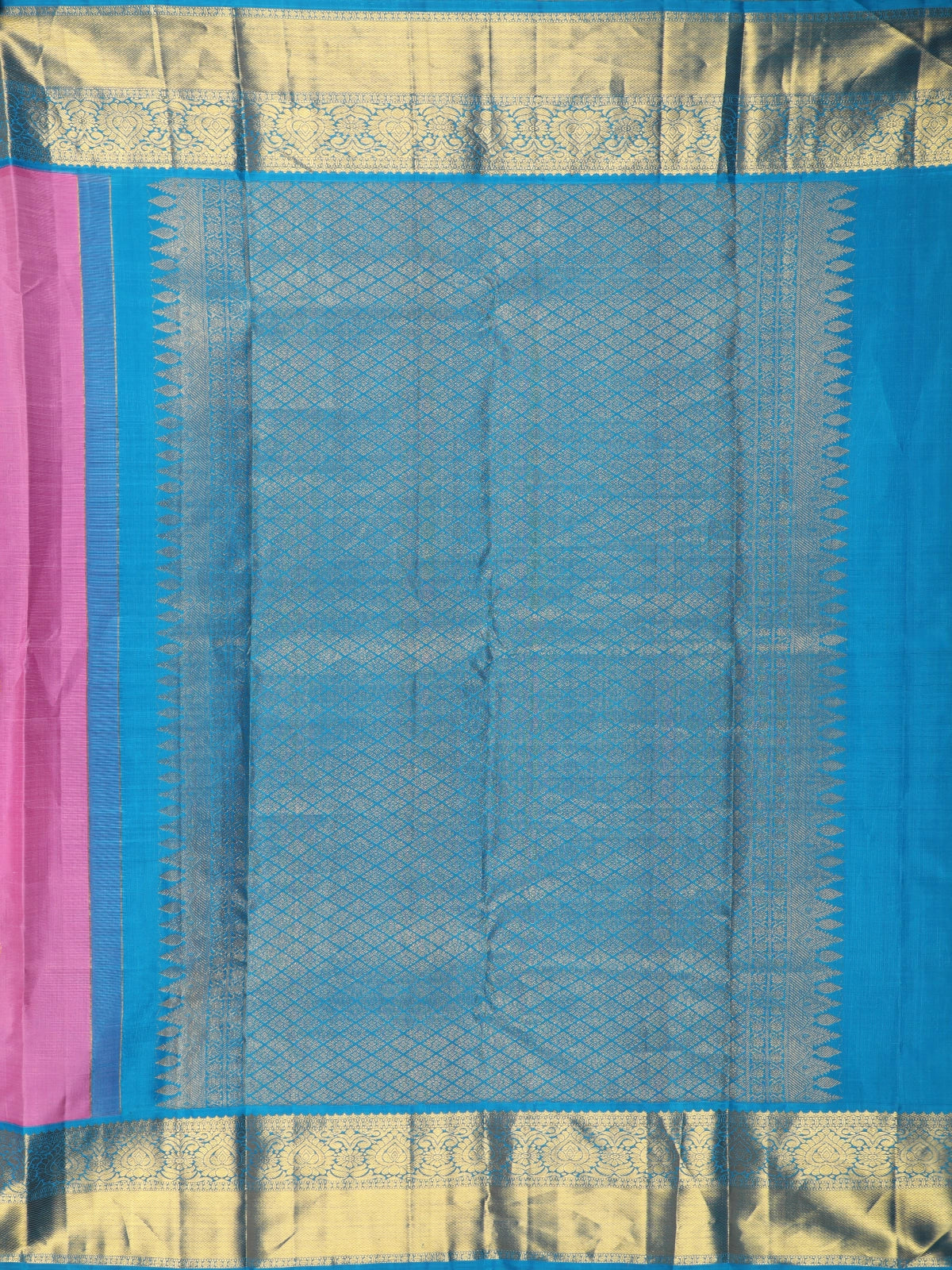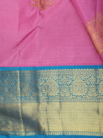 Contrasting beautifully, the saree features a rich teal blue border highlighted with shimmering gold zari, lending depth and a regal frame to the ensemble. The interplay of bright pink, royal blue, and antique gold creates a striking yet harmonious color palette that elevates the saree’s grandeur.