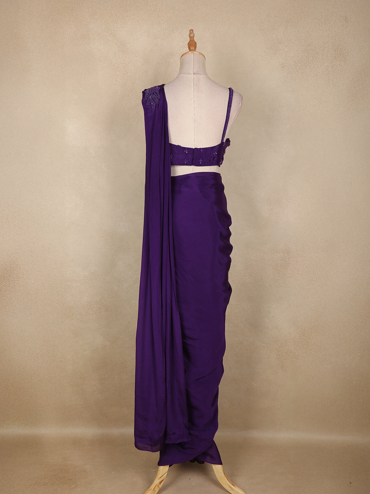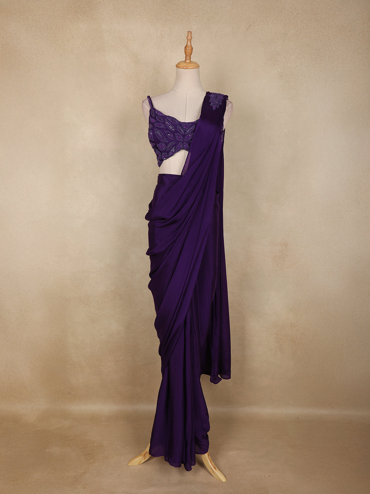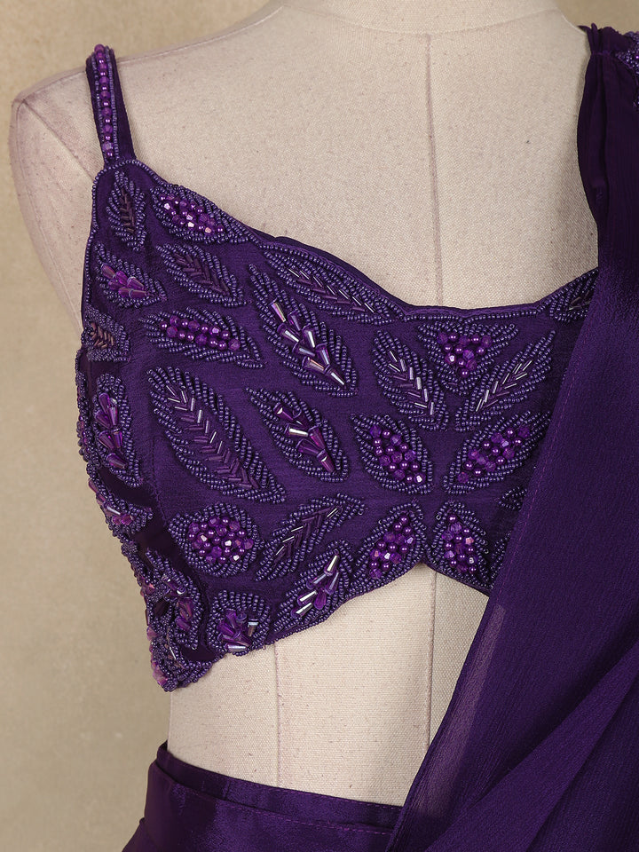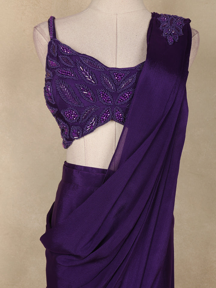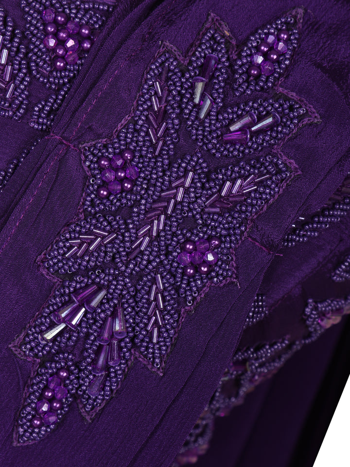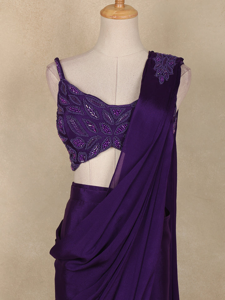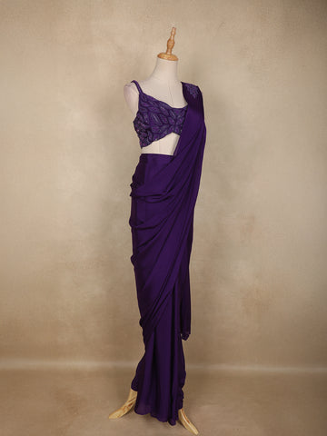 Step into the spotlight with this stunning violet ready-to-wear saree, an exquisite blend of elegance and modern charm. Crafted in soft, fluid georgette, the drape flows gracefully with every movement, making it a perfect choice for glamorous occasions.