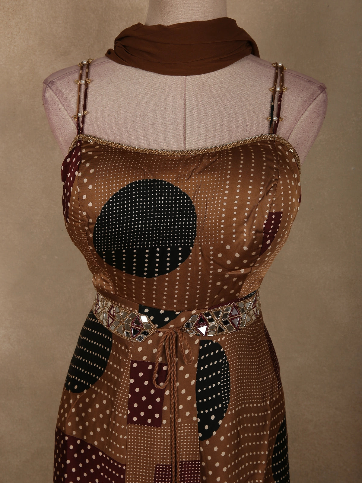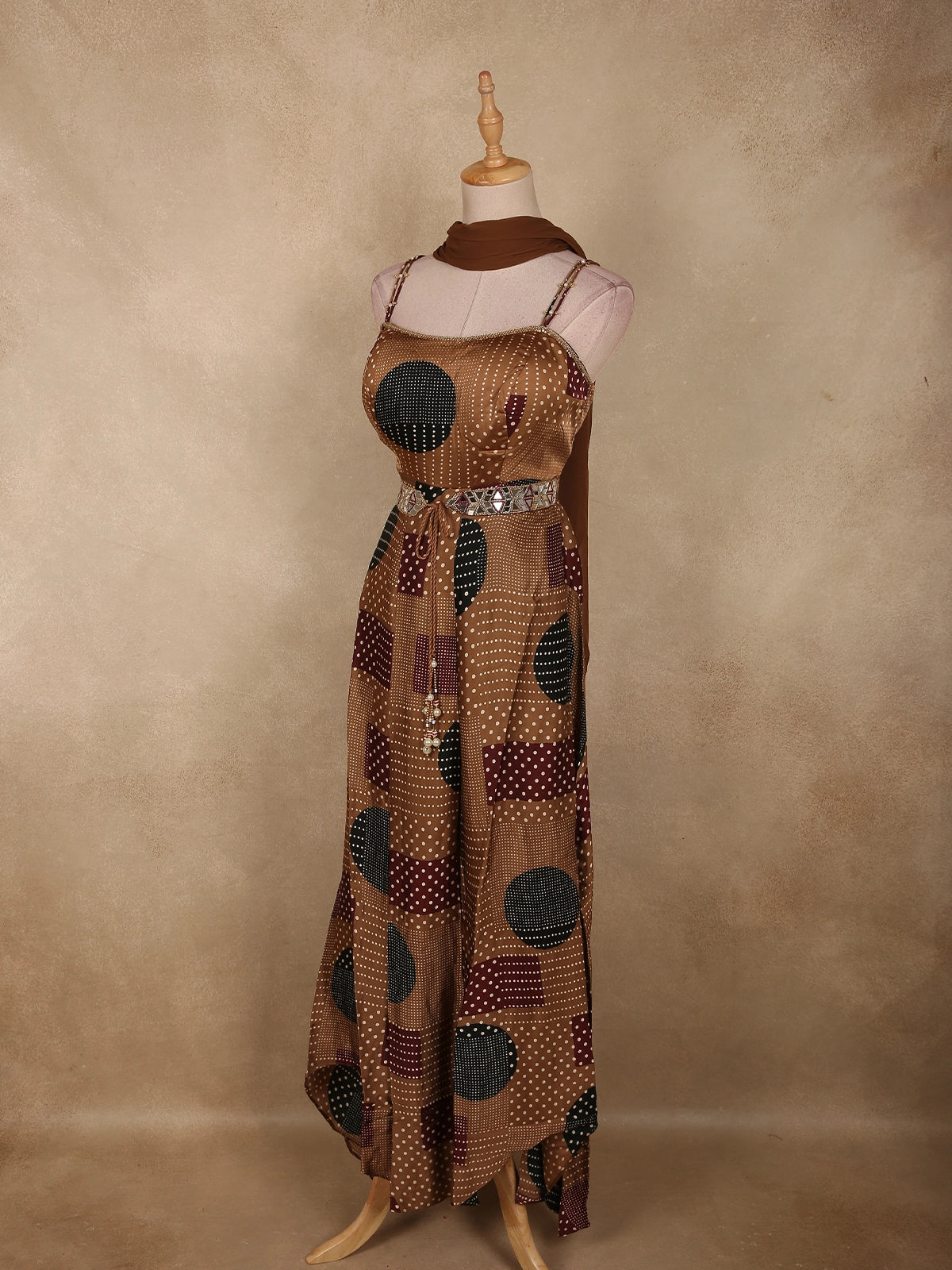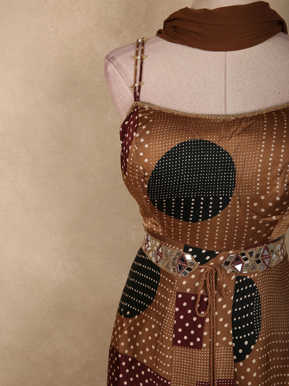 Infused with earthy elegance and modern flair, this Warm Coffee Brown crepe palazzo suit is a statement in contemporary ethnic styling. The kurta features a striking geometric print composed of bold circular motifs, patchwork-inspired blocks, and fine dotted patterns in complementary shades of maroon, deep olive, and ivory. The thoughtfully placed designs create visual depth while maintaining a balanced, sophisticated look.