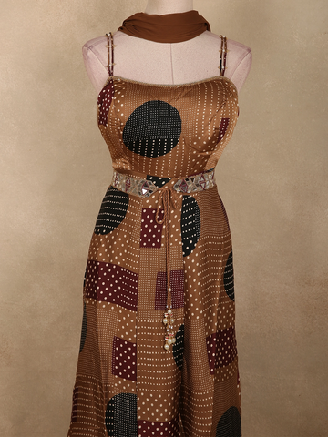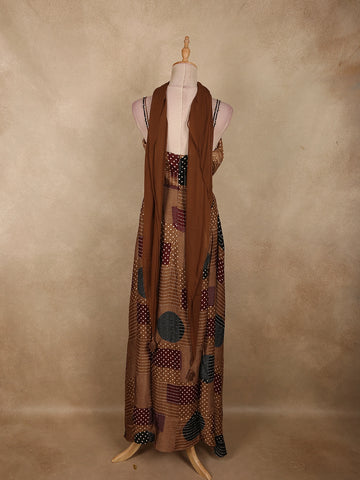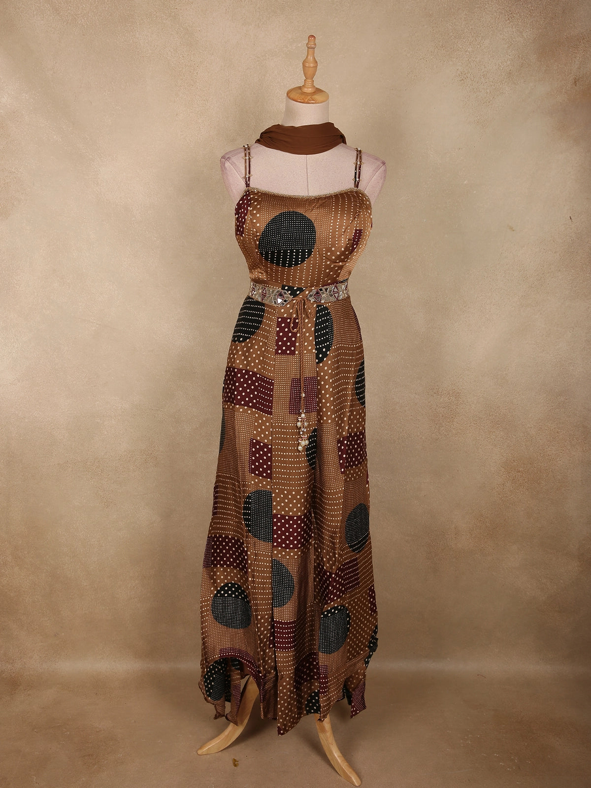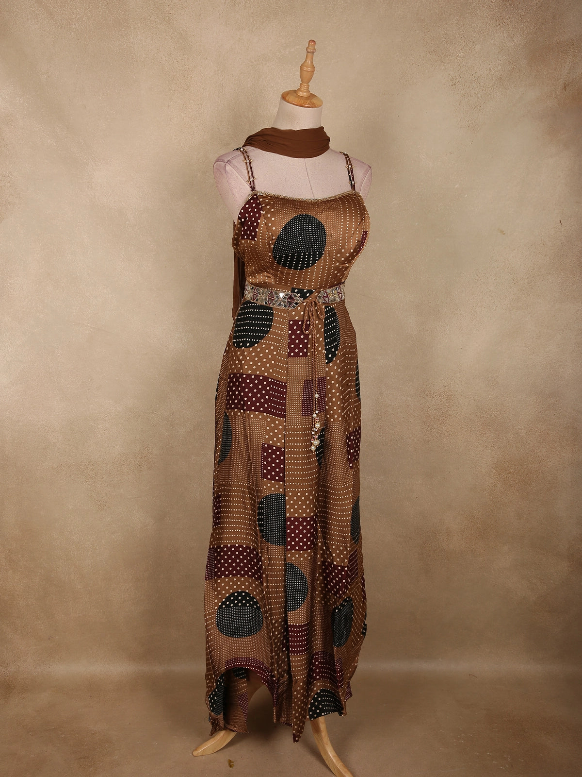 Infused with earthy elegance and modern flair, this Warm Coffee Brown crepe palazzo suit is a statement in contemporary ethnic styling. The kurta features a striking geometric print composed of bold circular motifs, patchwork-inspired blocks, and fine dotted patterns in complementary shades of maroon, deep olive, and ivory. The thoughtfully placed designs create visual depth while maintaining a balanced, sophisticated look.