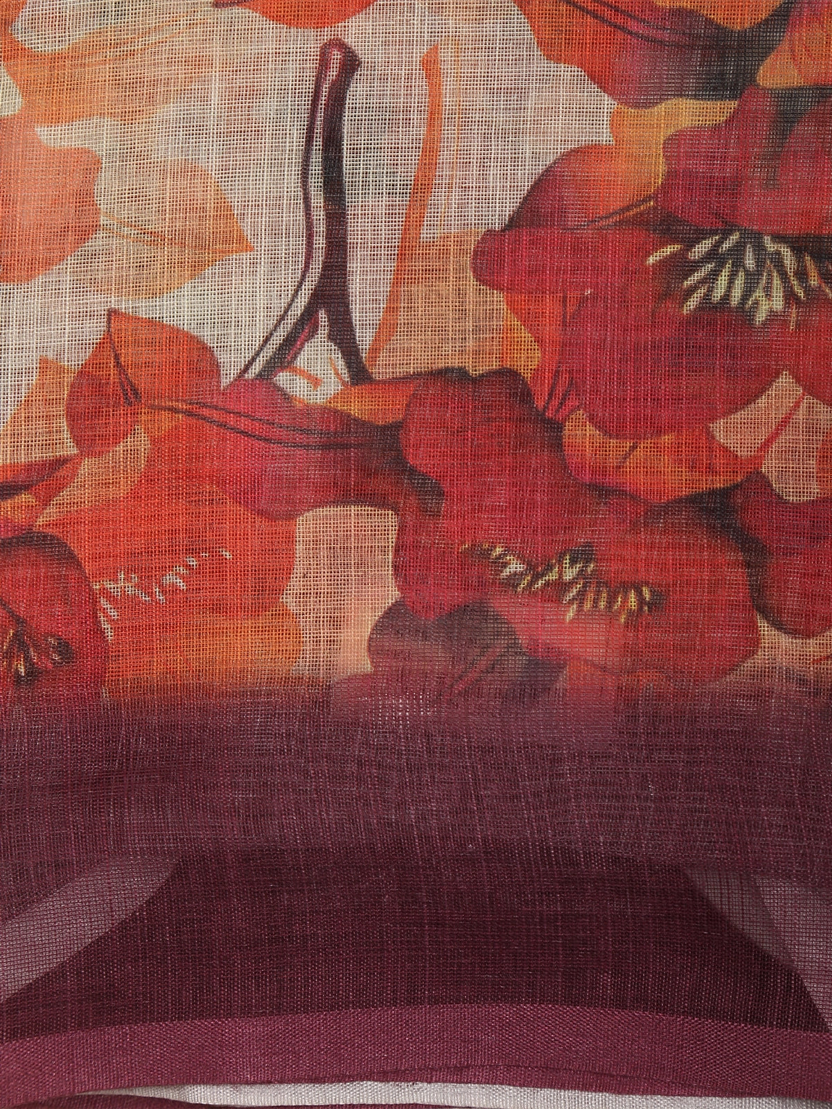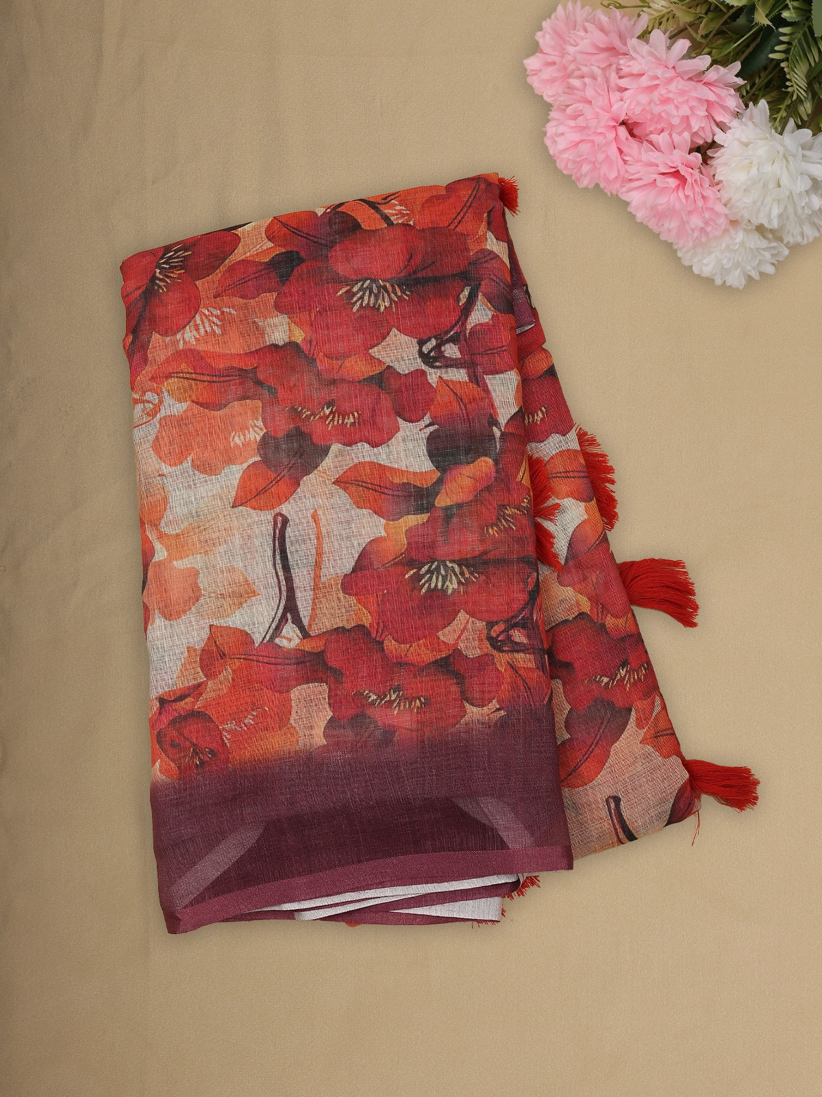 Graceful and artistically vibrant, this Warm Ivory Linen Cotton Saree beautifully showcases an elegant blend of soft neutrals and rich floral hues. The saree features a soothing warm ivory base, highlighted with bold floral printed motifs in shades of crimson red, burnt orange, and deep maroon, creating a striking yet sophisticated visual appeal.