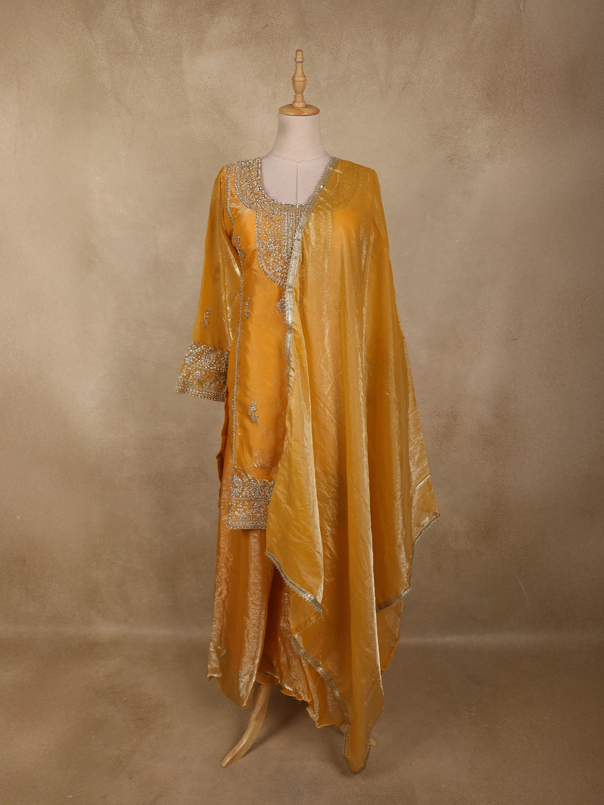 This Warm Mustard Gold Organza Palazzo Suit is a perfect blend of elegance and festive luxury. Designed in a rich mustard-gold hue with a soft luminous sheen, the kurta is exquisitely adorned with floral stone embellishments, featuring fine stones and delicate detailing that create a graceful sparkle. The embellished neckline and sleeve borders enhance the regal appeal, while maintaining a refined and balanced look.