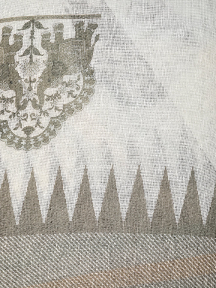 White and beige Elephant Printed Design Linen Cotton Saree with Contrast Woven Border