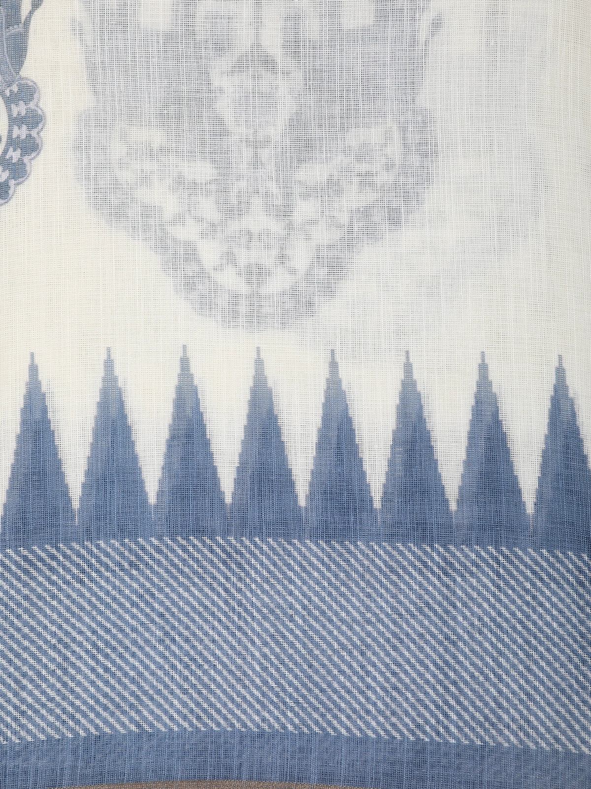 The lightweight linen-cotton fabric ensures a cool, breathable, and easy fall, making this saree ideal for long working hours, daily wear, and simple festive gatherings. The serene white base is beautifully highlighted with subtle blue detailing, while the contrast blue woven border adds a neat and refined finish to the entire look.
