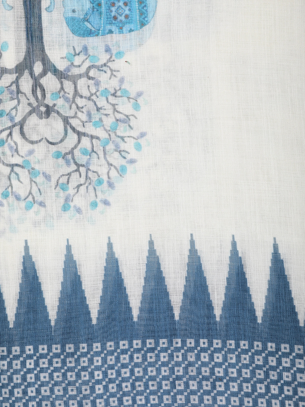 Graceful, light, and beautifully detailed, this White Linen Cotton Saree is adorned with a soothing blue-toned elephant and floral tree print that brings a touch of storytelling art to your drape. The design highlights the elegance of Indian folk motifs while keeping the look fresh and contemporary.
