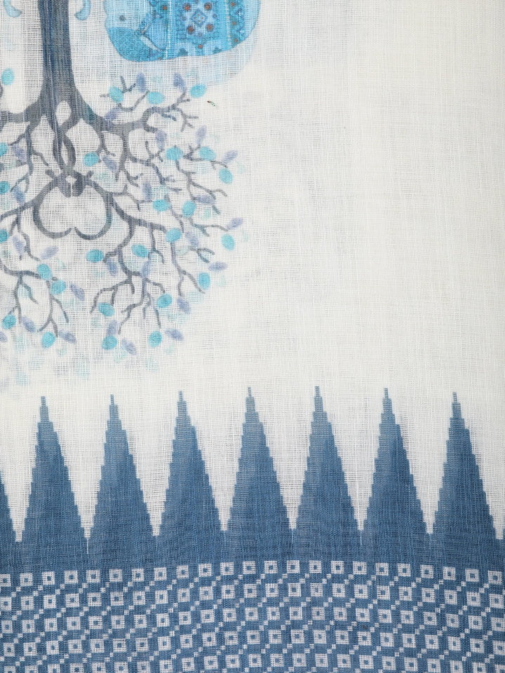 White Blue Elephant Printed Linen Cotton Saree with Contrast Woven Border