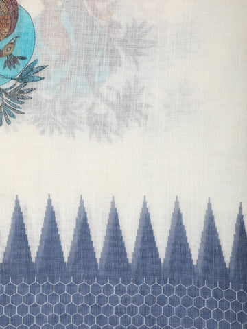 White Blue Peacock Printed Linen Cotton Saree with Contrast Woven Border